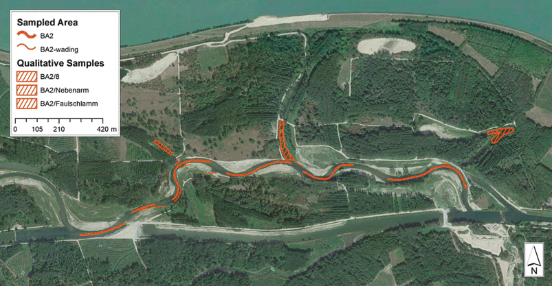 Beispiel einer Streifenbefischung anhand des zweiten Bauabschnitts. Breite Streifen (Flussmitte und Prallufer) wurden mit dem Boot beprobt, dünne mit dem Rückenaggregat. Schraffierte Bereiche sind qualitativ beprobte Nebengewässer