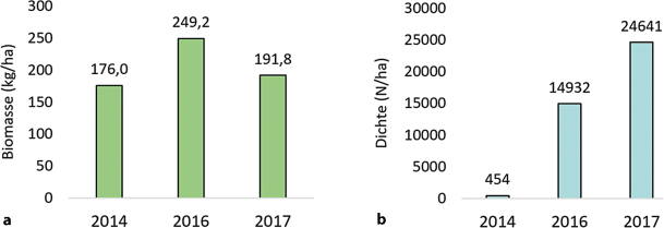 Entwicklung der Biomasse (a) und der Dichte (b) pro Hektar