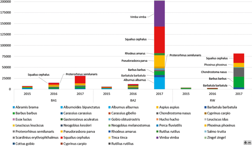 Die Auswertung der Streifenbefischungen über den bisherigen Untersuchungszeitraum zeigt bereits nach kurzer Zeit eine deutliche Veränderung der Fischbiozönose im gesamten Gebiet. So war zum Beispiel zum Zeitpunkt der Befischung im Jahr 2014 der Bauabschnitt 1 ungefähr vier Wochen fertiggestellt und geflutet. Im betroffenen Abschnitt konnten bereits nach dieser Zeit hohe Biomassen von adulten Barben, Nasen und Aiteln (Squalius cephalus) festgestellt werden.