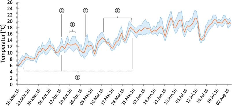 Tageswassertemperaturen der Restwasserstrecke im Jahr 2016 basierend auf Mittelwerten (orange Linie) und dem Schwankungsbereich zwischen Minimum und Maximum (schraffierter Bereich) im Frühjahr 2016. ① Zeitraum der Laichplatzkartierungen (strichliert) und Nachweis adulter Nasen und Barben im Untersuchungsgebiet (durchgehende Linie). ② Nachweis adulter Aitel im Untersuchungsgebiet. ③ Nachweis Nasenreproduktion. ④ Besatz Hucheneier. ⑤ Nachweis Barbenreproduktion