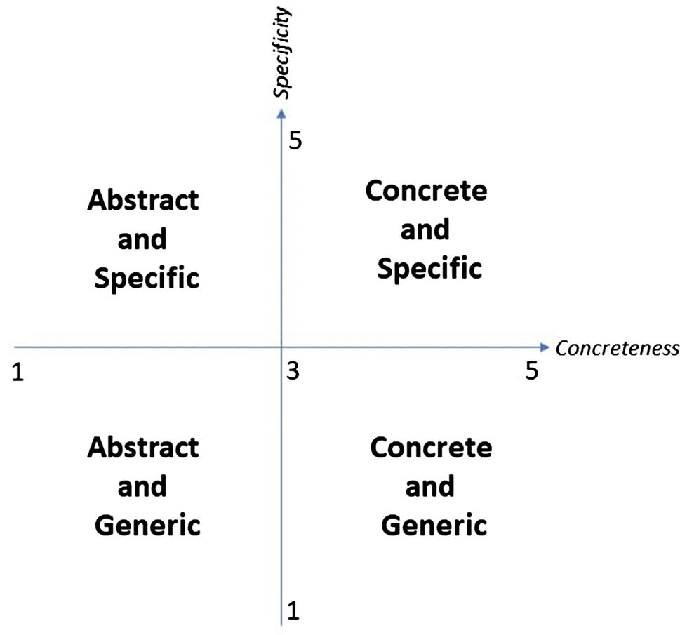 The remainder of this paper is structured as follows: In the “Theoretical background” Section, we provide an overview of various definitions of the polysemous term abstraction, and show that two potentially different phenomena are included and, at least in some cases, conflated within its general definition: These are conceptual concreteness and categorical specificity. In the “Study 1” and “Study 2” sections, we report two quantitative studies in which we operationalize and compare Specificity and Concreteness for a large sample of nouns. In the “Study 3” section, we report on a qualitative analysis in which we cross the two variables and describe which type of words appears in the four quadrants (highly abstract and generic words, highly abstract and specific words, highly concrete and generic words, and highly concrete and specific words). Finally, in the “General discussion,” we overview the results of our investigations and its implications within the cognitive-science community.4