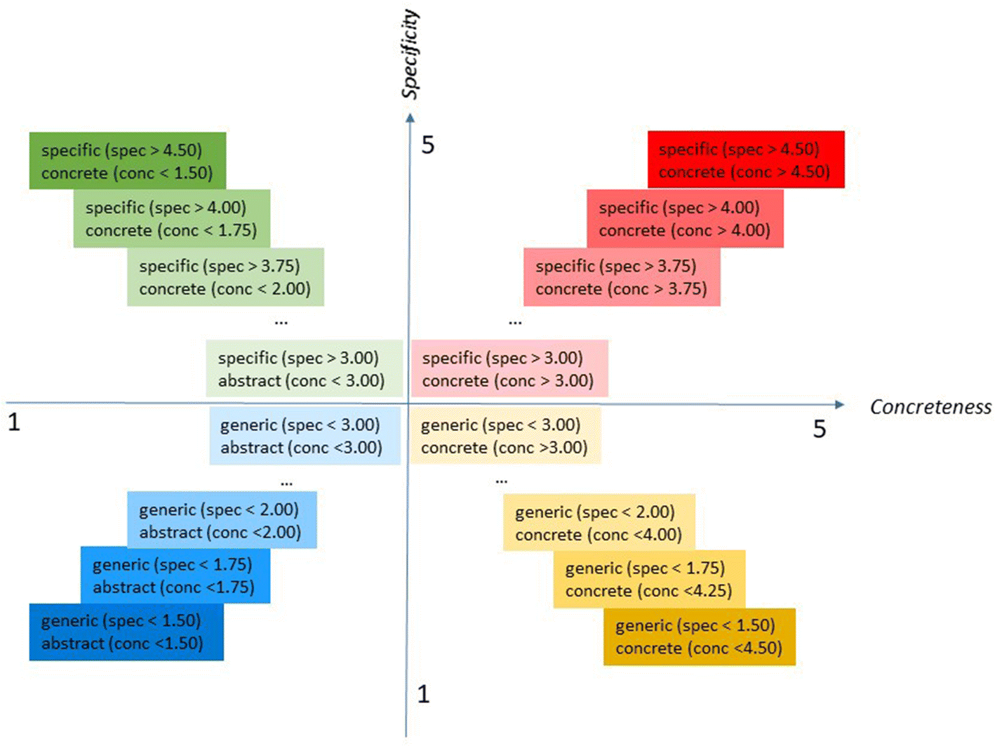 RQ3: What type of concepts can be found in the four intersections of the two variables (Specificity and Concreteness)?