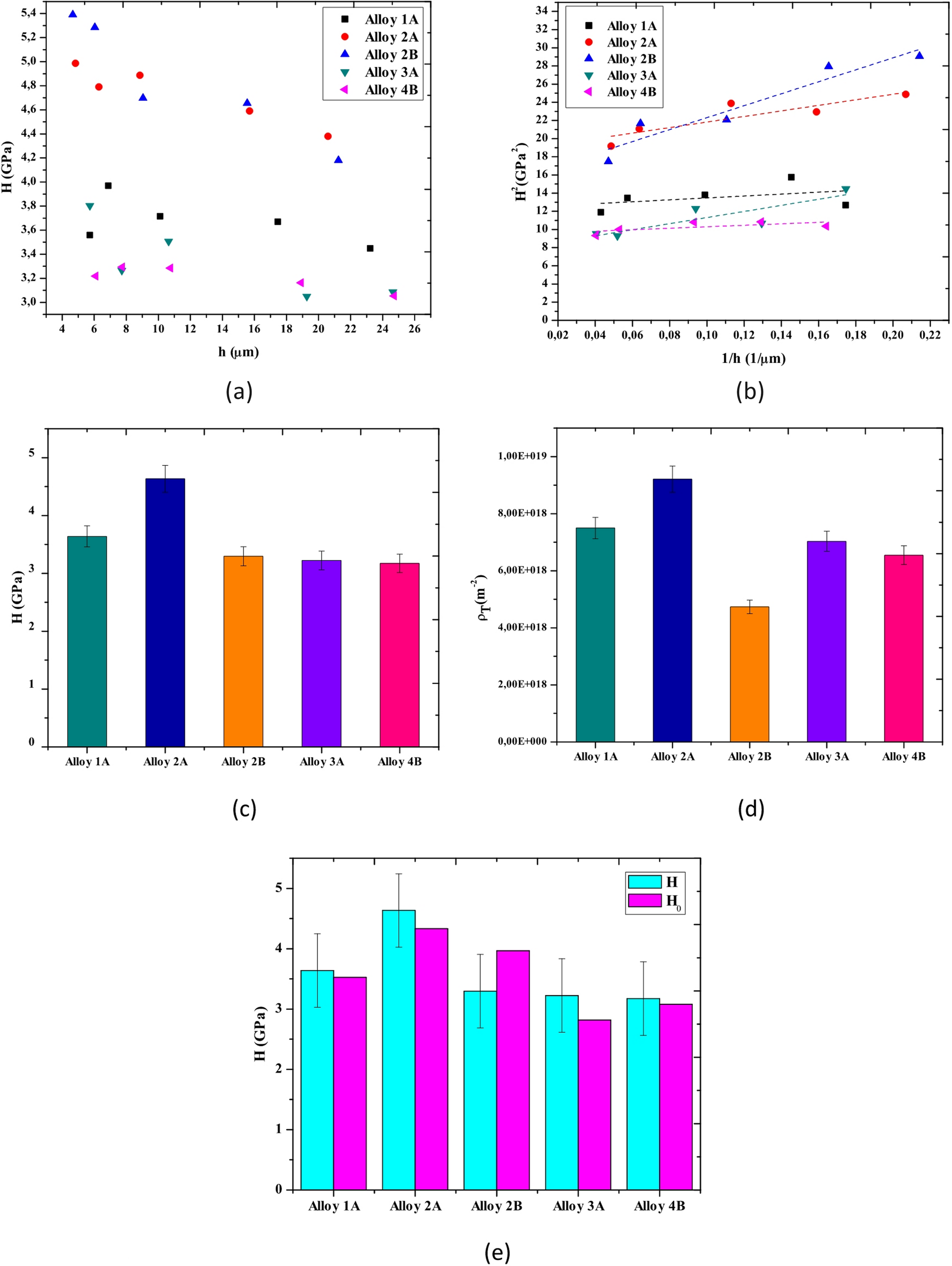 Gao and Nix Model graphs a) hardness vs depth, b) H2 vs 1h c), hardness test results, d) total dislocations and e) Real hardness (H0) as calculated by Nix and Gao model vs experimental hardness
