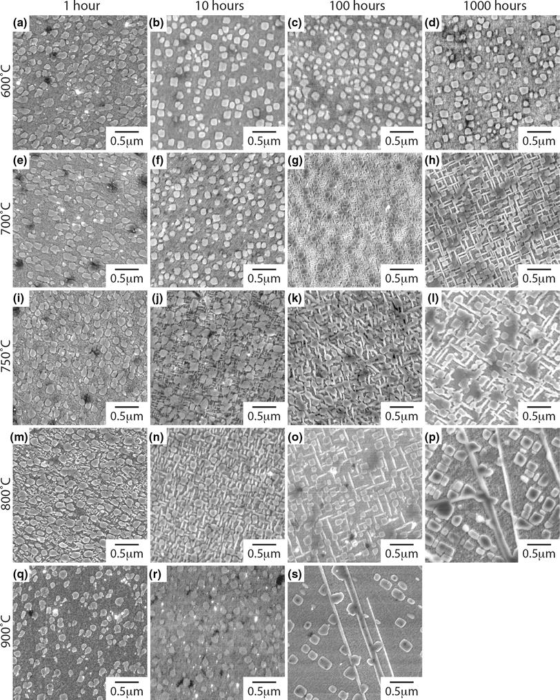 SEI micrographs of the alloy following thermal exposure at 873 K (600 °C) for (a) 1 h, (b) 10 h, (c) 100 h, and (d) 1000 h; 973 K (700 °C) for (e) 1 h, (f) 10 h, (g) 100 h, and (h) 1000 h; 1023 K (750 °C) for (i) 1 h, (j) 10 h, (k) 100 h, and (l) 1000 h; 1073 K (800 °C) for (m) 1 h, (n) 10 h, (o) 100 h, and (p) 1000 h; 1173 K (900 °C) for (q) 1 h, (r) 10 h, and (s) 100 h