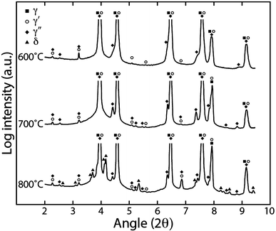 To identify the phases present, synchrotron X-ray diffraction data were acquired from the samples exposed for 1000 hours at 873 K, 973 K, and 1073 K (600 °C, 700 °C, and 800 °C), Figure 2. The diffraction data obtained from all samples investigated contained reflections corresponding to a γ matrix and γ′ precipitates. Notably, the sample exposed at 873 K (600 °C) exhibited a large asymmetry in the fundamental reflections, which is most apparent as a pronounced shoulder on the {311} γ reflection (~7.5 deg 2θ). This asymmetry is consistent with the presence of the γ″ phase, as the c axis of the γ″ possess a lattice parameter greater than twice that of the lattice parameter of the cubic γ and γ′, which manifests as a smaller diffraction angle for the {312} γ″ fundamental reflection than the {311} γ. The sample exposed for 1000 hours at 973 K (700 °C) showed clearly identifiable isolated reflections corresponding to the γ, γ′, and γ″ precipitates. The superlattice reflections of the two precipitates were well defined throughout the patterns and the shoulders on the fundamental reflections observed at 873 K (600 °C) became distinct peaks. Following exposure for 1000 hours at 1073 K (800 °C), large laths were visible in the micrograph, Figure 1(p), and the diffraction data corresponding to this condition exhibited distinct reflections consistent with the δ phase. The most pronounced reflections associated with this phase were the {012} and {211} at ~4.3 deg 2θ, the {221} reflection at ~5.4 deg 2θ, and the {400} at ~6.8 deg 2θ. These are distinct from the η phase, observed recently in some high Nb alloys,[25,26] as the η phase does not exhibit a doublet at ~4.3 deg 2θ, while the {023} reflection that is exhibited by the η phase at ~4.7 deg 2θ is absent in the pattern presented below. However, despite the apparent transformation of γ″ to the thermodynamically stable δ phase, reflections corresponding to the γ″ phase could be identified. This indicated that even following a 1000-hour exposure at 1073 K (800 °C), γ″ precipitates persisted in the microstructure.