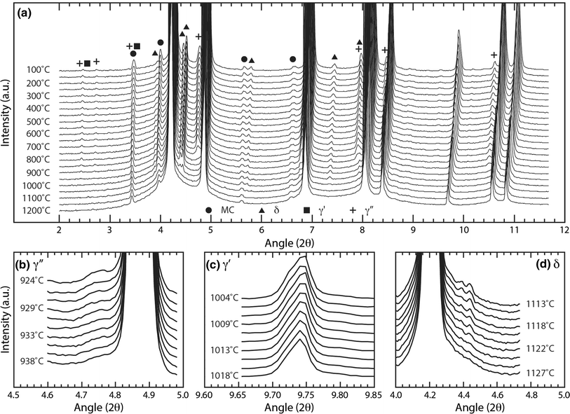 Synchrotron X-ray diffraction data obtained during heating of the dual-superlattice superalloy. (a) Overview of the diffraction data obtained from 373 K to 1473 K (100 °C to 1200 °C). Detailed regions around diffraction peaks that show the dissolution of the (b) γ″, (c) γ′, and (d) δ phases to ascertain their associated solvus temperatures