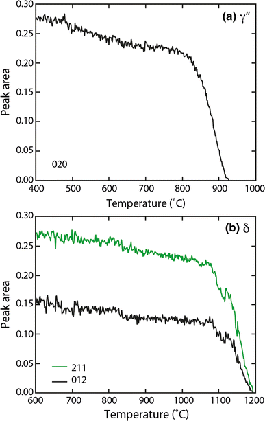 Plots of the area of selected diffraction peaks as a function of temperature. (a) The {004} peak of the γ″ phase and (b) the {211} and {012} peaks of the δ phase