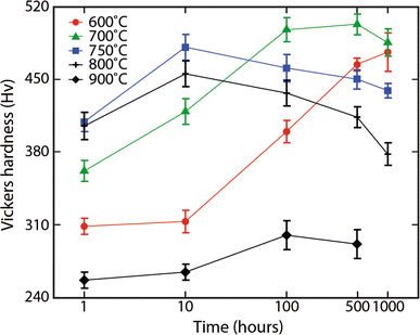 Room temperature hardness data following thermal exposures between 873 K and 1173 K (600 °C and 900 °C) for 1 to 1000 h