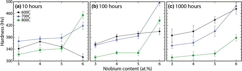 The variation in hardness of Ni-15Cr-xAl-(10-x)Nb alloys with varying Nb content for exposures of a) 10 h, b) 100 h, and c) 1000 h at temperatures of 873 K, 973 K, and 1073 K (600 °C, 700 °C, and 800 °C)[29]