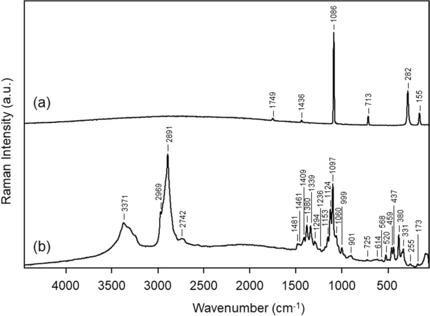 The possible presence of cellulosic residues on stone surface after the cleaning treatment was evaluated by µ-Raman analysis using a Senterra spectrometer (Bruker Optics, Gmbh, Ettlingen, Germany), equipped with a CW diode-pumped solid-state laser emitting at 532 nm. Analysis was conducted on a selected area of a marble specimen before and after a 24 h-treatment with the OBC-H hydrogel. The spectral resolution was 9 cm−1 and time of acquisition and number of scans were selected for reducing the fluorescence interferences. Five spectra were acquired on random spots of the selected area. A Raman spectrum of the sample dried at 60 °C was acquired as a reference.