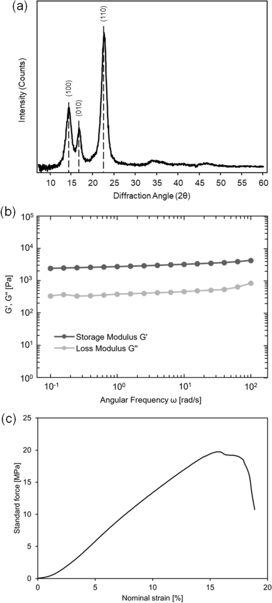 Characterization of the BC hydrogel. a X-ray diffraction profile. Broken vertical lines indicate the positions of the main diffraction peaks, corresponding Miller indices of Cellulose Iα are indicated. b Viscoelastic behaviour studied by frequency sweep. c Representative stress (MPa)—strain (%) curve generated during tensile testing