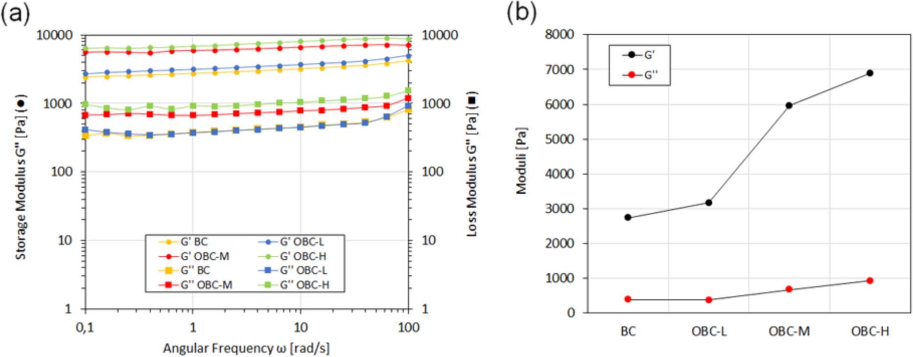Frequency sweeps on OBC hydrogels were used to determine their viscoelastic behavior (Fig. 5a). Like pristine BC, all samples showed a storage modulus (G') greater than the loss modulus (G'') across the frequency range, indicating that the elastic response is dominant. Additionally, the storage modulus (G') remained linear and nearly constant throughout the angular frequency range for all samples, demonstrating that the ozonated cellulose network remains stable even at higher frequencies. Furthermore, an increase in the elastic modulus of the systems can be observed with the higher content of ozone (Fig. 5b).