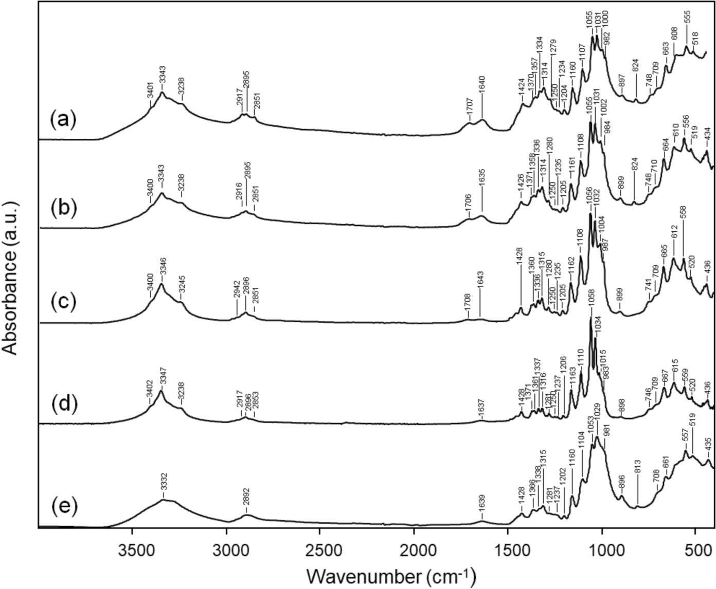 Investigation by ATR-FTIR spectroscopy of the influence of ozonation on the chemical structure of BC hydrogel. Infrared spectra of OBC-H (a), OBC-M (b), OBC-L (c), pristine BC (d) hydrogels and pure cellulose (Sigma Aldrich CAS No. 9004–34-6) (e)