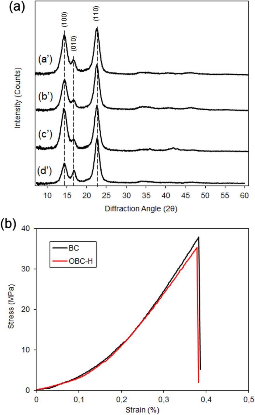 Characterization of the OBC hydrogels. a X-ray diffraction profile of OBC-H (a’), OBC-M (b’), OBC-L (c’), pristine BC (d’). Broken vertical lines indicate the positions of the main diffraction peaks, corresponding Miller indices of Cellulose Iα are indicated. b Representative stress (MPa)—strain (%) curve generated during tensile testing of the dried BC and OBC-H samples
