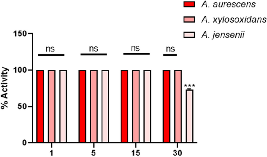 Evaluation of the shelf-life of OBC-H hydrogel through the viability of A. aurescens, A. xylosoxidans and A. jensenii. Samples were stored in ozonated batch water at 4 °C for 1, 5, 15, and 30 days and then tested on bacterial and spore suspensions. Microorganisms’ viability was determined through CFU counting analysis and results are reported as percentages of the relative activity related to the fresh ozonated hydrogels. Statistical significance was determined using a one-way ANOVA analysis with the Bonferroni post-test (ns indicating no significance; ***p < 0.001 compared to the control)