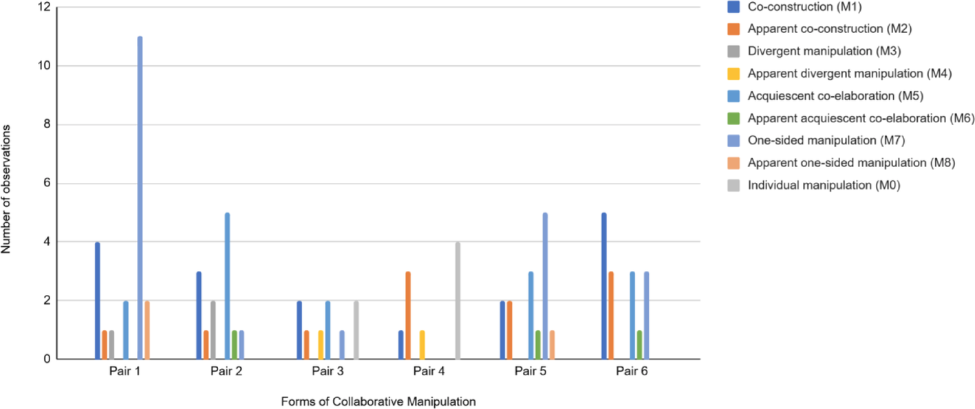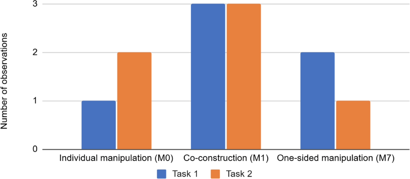 To answer our first research question (RQ1), which examines the pairs’ cooperative manipulation, we analyzed the frequencies and sequential patterns of codes related to each of the cooperative manipulation types (Co-construction, Apparent co-construction, Divergent manipulation, Apparent divergent manipulation, Acquiescent co-elaboration, Apparent acquiescent co-elaboration, One-sided manipulation, apparent One-sided manipulation, Individual manipulation). The quantitative data from the coding grid showed the shift in the distribution of these pairs’ cooperative manipulation over the course of the task, while the qualitative analysis of the corresponding video segments provided contextual examples of how these roles were expressed and how participants negotiated them.
