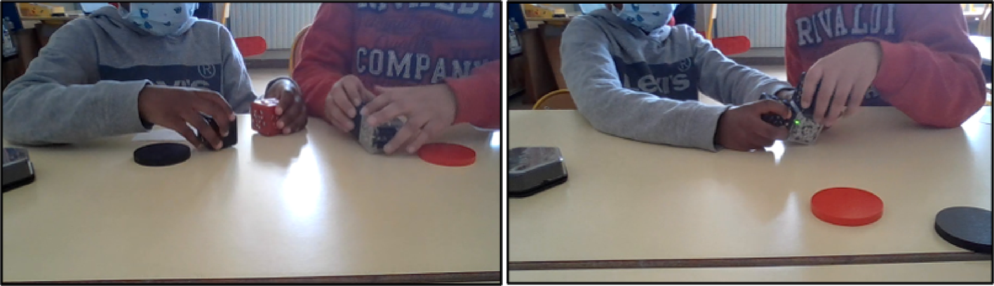 In Pair 1, the interaction is mostly based on turn-taking (M7), in which the participants manipulate the cubes to propose a new figure /solution (Capture on the left 6:20, capture on the right 7:12).