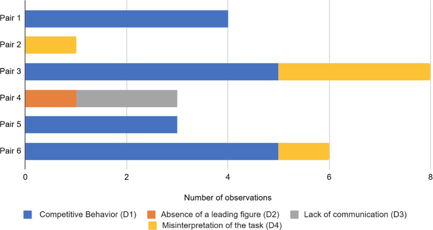 Throughout the activity, the participants faced the following difficulties that negatively affected their collaboration: competitive behaviour (D1), absence of a leading figure (D2), lack of communication (D3), and misinterpretation of the task (D4). Figure 9 reports that these difficulties occurred.