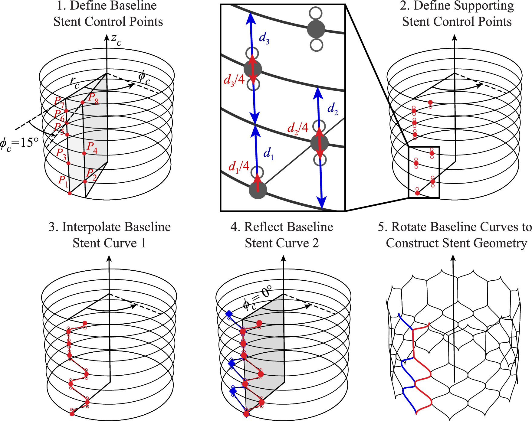 As the first step in the geometry generation process for the stent, the defined set of baseline points is first constructed, as shown in Step 1 of Figs. 2 and 3 for the THV-A and THV-B valves, respectively. These points define the physical location where two stent wires will intersect in the final geometry; however, additional support points are necessary to maintain consistent curve tangents at the point where two curves are connected. For a cubic non-uniform rational B-spline (NURBS) curve, the local tangents at this connection point can be maintained by three collinear control points [25]: one baseline point and two supporting points. For the top and bottom connection points at the maximum and minimum \(z_c\) locations, respectively, these supporting points are linearly offset by 25% of the distance between the adjacent vertical cross-sections above or below the connection point (e.g., \(d_1\) in the inset of Figs. 2 and 3). For any interior connection points, the supporting points are linearly offset by 12.5% of the distance between the adjacent vertical cross-sections above and below the connection point (e.g., \(d_2\) and \(d_3\) in the inset of Figs. 2 and 3), which results in a consistent relative offset distance between all the support points that maintains a reasonably scaled curvature at the connection points. These distances can also be modified to achieve “smoother” or “sharper” attachments between the final stent curves. The definition of the support points for the stent is shown in Step 2 of Figs. 2 and 3. Once the baseline and support control points are defined, a single cubic NURBS curve can be constructed as the stent curve, as shown in Step 3 of Figs. 2 and 3. From this first curve, the second baseline curve can be constructed by reflecting the first curve across the vertical plane at \(\phi _c = 0^{\circ }\) (Step 4 of Figs. 2 and 3). Because both curves were constructed consistently based on \(\phi _c\) to achieve a symmetric distribution of sections around the stent geometry, this set of two curves can be rotated about the \(z_c\)-axis in increments of twice the maximum \(\phi _c\) angle to achieve the final set of stent curves, as shown in Step 5 of Figs. 2 and 3.