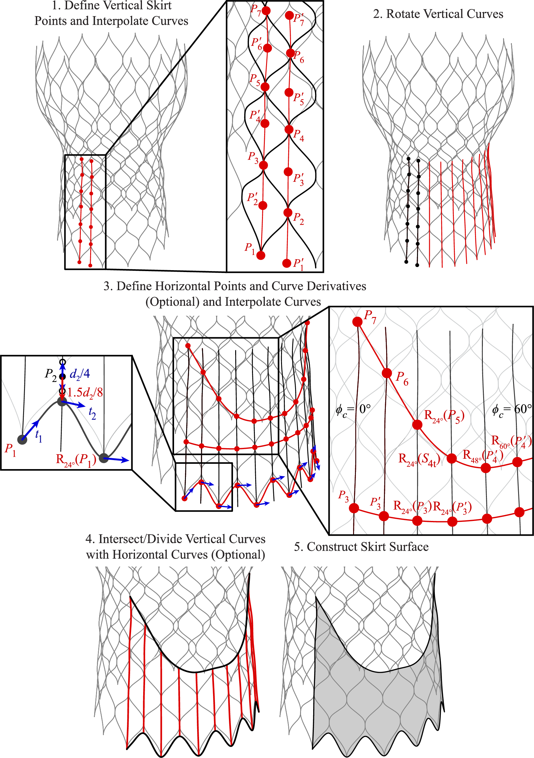 In Step 3 of Figs. 4 and 5 and future geometry construction steps, \(\text {R}_{\phi _c}(\varvec{\cdot })\) indicates a geometry rotation by an angle of \(\phi _c\) degrees about the \(z_c\)-axis (e.g., in Step 3 of Fig. 4, \(R_{{24^{\circ }}}(P_{1})\) indicates that \(P_1\) is rotated \(24^{\circ }\) about the \(z_c\)-axis). Rotations about the \(z_c\)-axis are evaluated in increments of the maximum \(\phi _c\)-coordinates of the stent for each configuration. The geometry is also radially symmetric about the zc-axis, and the third of the geometry that is defined between \(\phi _c = 0^{\circ }\) and \(\phi _c = 120^{\circ }\) is symmetric across the vertical plane at \(\phi _c = 60^{\circ }\). With these horizontal curves defining the top and bottom edge of the skirt, the vertical curves that were defined in Step 2 can be split, if necessary, into smaller sections based on the intersection points that are used to construct the top and bottom horizontal curves, as shown in Step 4 of Figs. 4 and 5. The skirt is then constructed as a Gordon surface from the set of vertical and horizontal cubic NURBS curves that describe the bidirectional curve network defining the surface, and the final geometry is shown in Step 5 of Figs. 4 and 5.