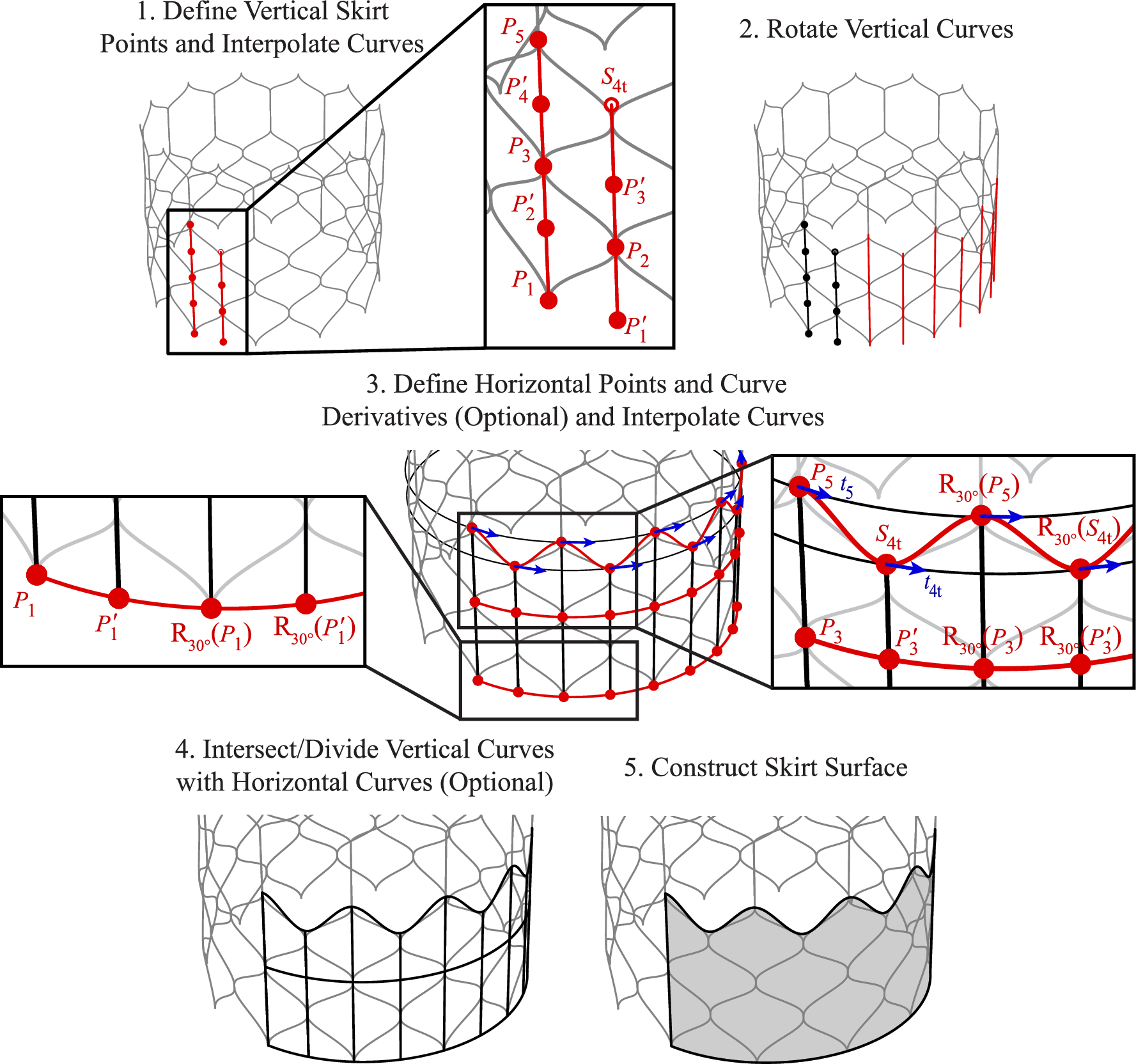 The next step of the geometry construction process focuses on the skirt, and the parameters for this procedure are shown in Figs. 4 and 5. The first geometries constructed are the two vertical curves that provide the baseline for the skirt. These curves are defined by interpolating a combination of the baseline stent control points (P), baseline stent control points with inverted \(\phi\) coordinates (indicated as \(P\,'\)), and supporting points where relevant (indicated as \(S_t\) or \(S_b\) for the top or bottom support point, respectively), as shown in Step 1 of Figs. 4 and 5. Once these two vertical curves are constructed, they are rotated by consistent angles in increments of \(\phi _c\) about the central \(z_c\)-axis to generate one-third of the skirt, as shown in Step 2 of Figs. 4 and 5. In Step 3 of Figs. 4 and 5, the horizontal skirt curves that define the top and bottom edges of the skirt are constructed based on another set of stent baseline control points, supporting stent control points, and a subset of rotated or translated baseline or supporting stent control points that approximate the skirt configuration for the desired THV geometry. Curve derivatives can also be incorporated for these horizontal curves if necessary to maintain consistent tangents at each point.