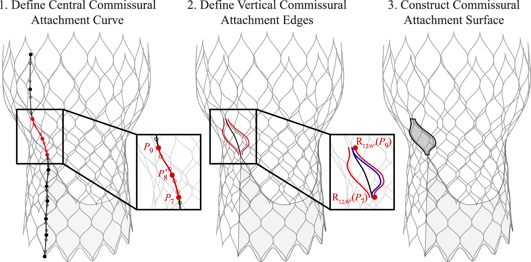 In this work, the surfaces that attach the upper portions of each leaflet to the stent are designated as the “commissural attachments.” These surfaces are critical structures that maintain the leaflet shape and, in practice, ensure that the leaflets can be sutured to the upper section of the stent. The construction procedure for the commissural attachments is shown in Figs. 6 and 7. The initial commissural attachment surface is constructed based on a section of the baseline stent curve. When defining these surfaces, a central curve at \(\phi _c = 0^{\circ }\) is first defined based on a combination of the baseline stent control points, baseline stent control points with inverted \(\phi\) coordinates, and supporting points where relevant, as shown in Step 1 of Figs. 6 and 7. Once the central curve is constructed, the two vertical edges of the commissural attachment are then defined, as shown in Step 2 of Figs. 6 and 7. For this step, a specified curve, either the central commissural curve or the section of the baseline stent curve with the same endpoints as the central commissural curve, is rotated about the central \(z_c\)-axis by \(\phi _c/6\) for the maximum \(\phi _c\) stent coordinate and is then reflected across the vertical plane at \(\phi _c = 0^{\circ }\). These two edges and the central commissural curve define a set of three curves that are then lofted to create the commissural attachment surface shown in Step 3 of Figs. 6 and 7.