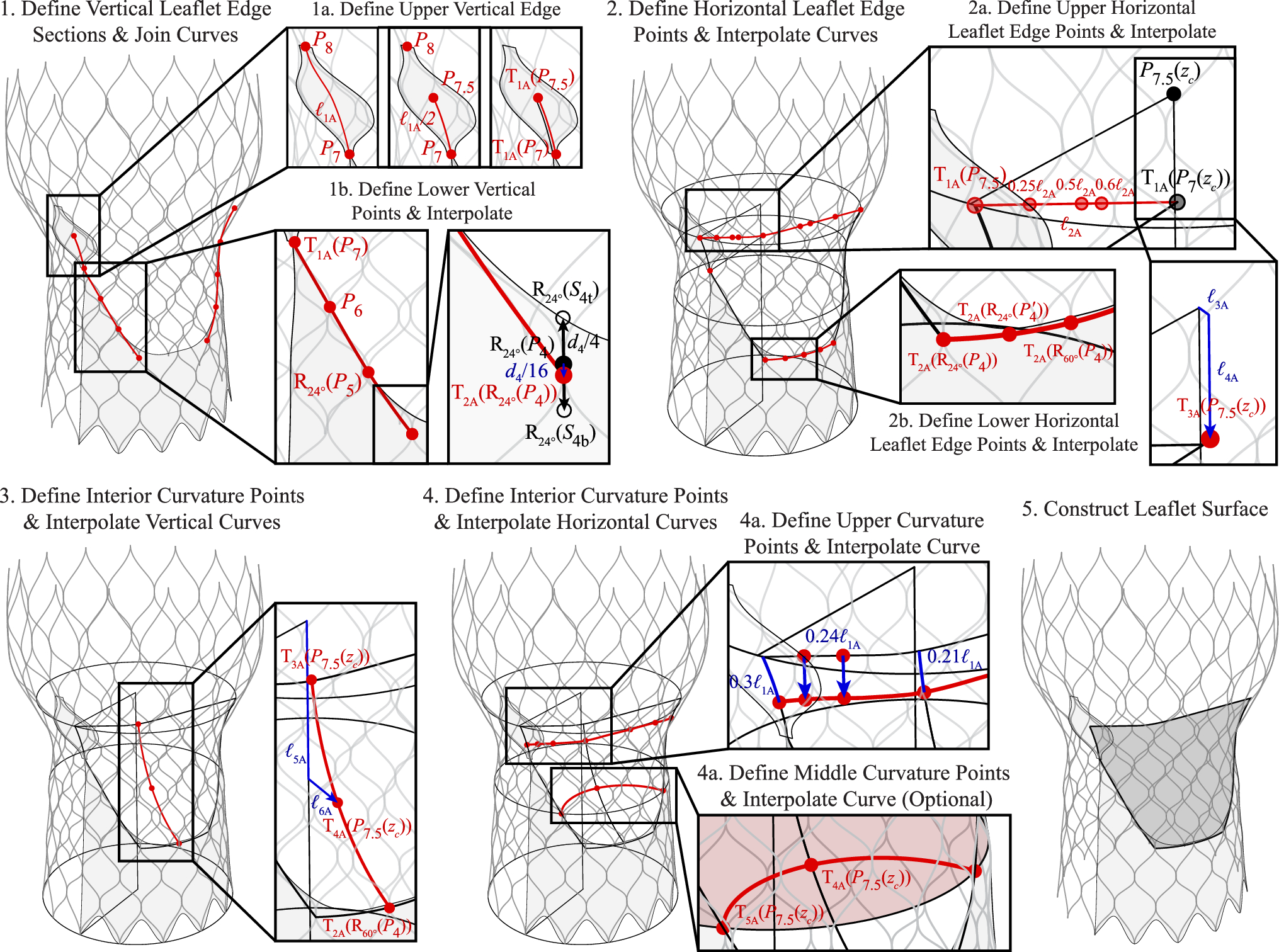 The leaflet parameterization is similar to a previous aortic valve parameterization that controls the leaflet attachment edges, free edge, and central curvature [29]. This general approach is adapted to work effectively with the THV configuration. The reference points for the vertical edges of the leaflets are first identified from the stent baseline points and the commissural attachment surfaces. As shown in Step 1 of Figs. 8 and 9, the leaflet edges are constructed from two generated curve sections that are joined at their common endpoints. Step 1a shows the process for constructing the upper portion of the vertical edge from the central commissural attachment edge. This central curve is first extracted and, if necessary, divided into subsections to account for any offset of the vertical edge of the leaflet from the top or bottom of the commissural attachment surface. Once the full or partial central curve is extracted, it can be translated along the tangential direction of the commissural surface normal to the vertical plane at \(\phi _c = 0^{\circ }\). Geometry translation operations on points or curves are indicated by \(T (\varvec{\cdot })\) (e.g., in Step 1a of Fig. 8, \(T_{\text {1A}}(P_{7})\) indicates the first geometry translation operation for the THV-A geometry, which is performed on \(P_7\)). At this step, the curves are translated by 0.12 mm and 0.15 mm for the THV-A and THV-B valves, respectively. The lower portion of the vertical edge curve is constructed from several points that are extracted from a combination of the set of baseline stent control points, baseline stent control points with inverted \(\phi\) coordinates, supporting points, and transformed points (rotations or translations) from the same set, as shown in Step 1b of Figs. 8 and 9. The generated vertical curve geometry is then reflected across the vertical plane at \(\phi _c = 60^{\circ }\).