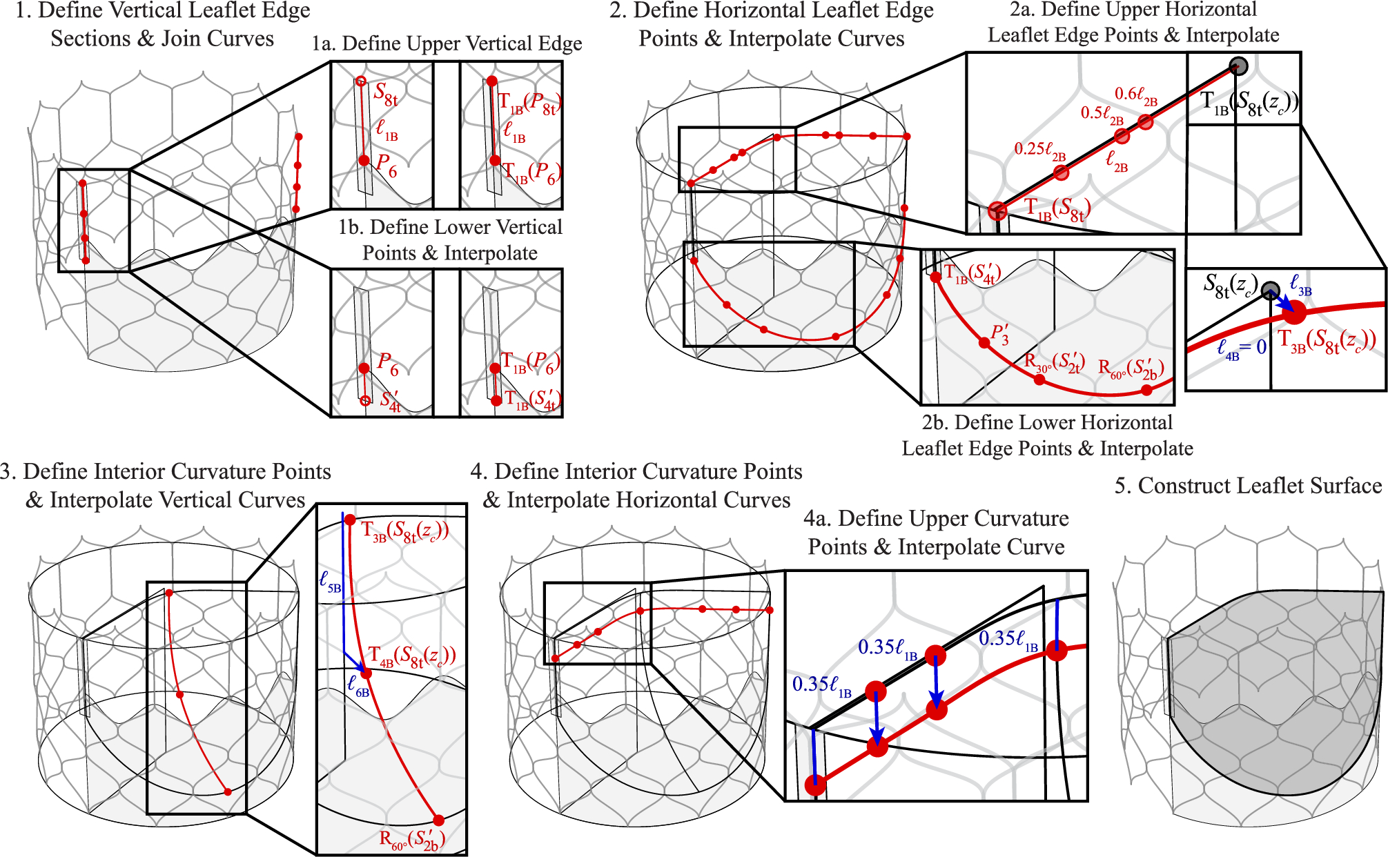 The final set of vertical and horizontal curves is then used to construct one valve leaflet as a Gordon surface, and the final leaflet geometry is shown in Step 5 of Figs. 8 and 9.