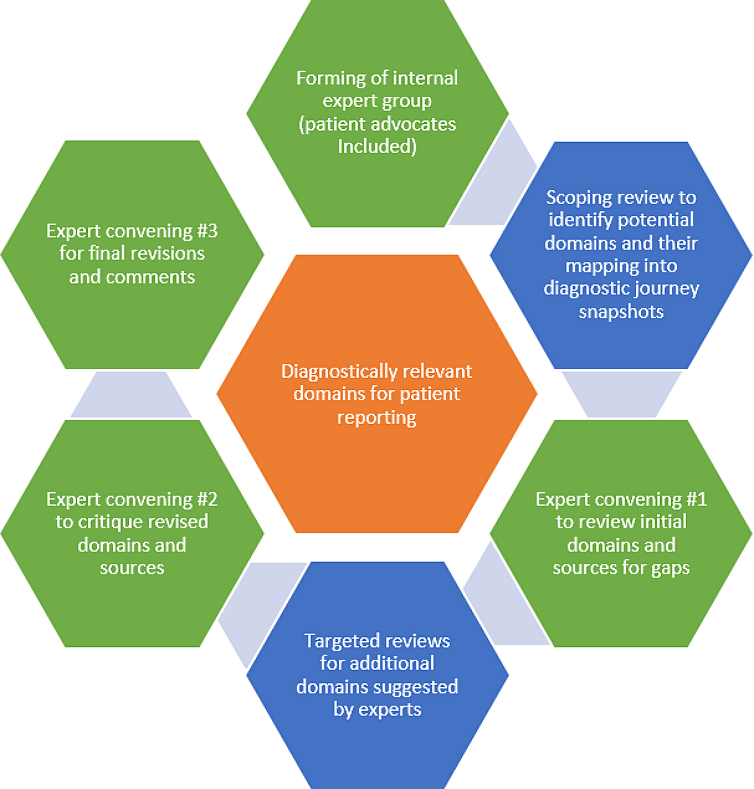 The research team shared and discussed literature findings with an internal expert group (8 researchers and 2 patient advocates in total) and at the expert convening (session #1). When additional PROs and PREs domains were emerging during these consultations, the research team conducted targeted searches to identify literature to supplement experts’ input. For example, the domain of accuracy of information was identified as initially missing, and the domain of feeling of being reassured was supplemented with examinations of false reassurance.