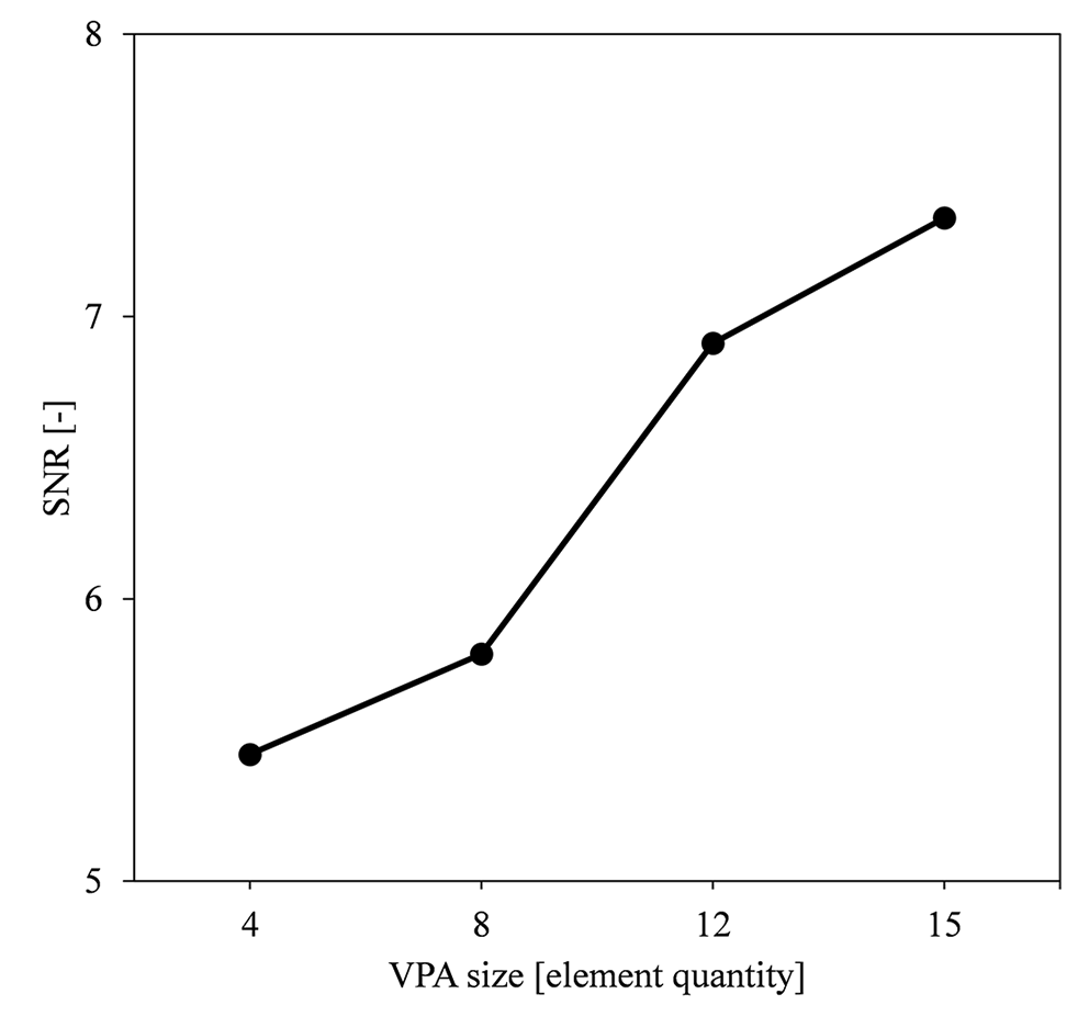 Relationship between the VPA size and the average SNRs of the UT signal from all FBHs