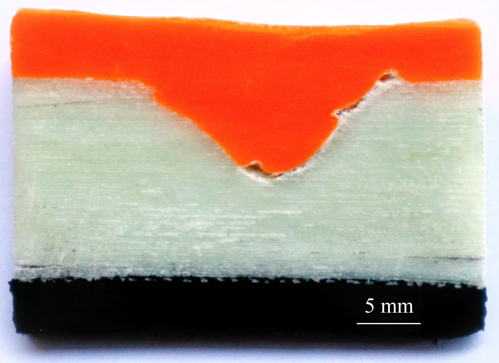 Cross-sectional view of the TCP sample at the defective area within the composite laminate layers introduced during the pipe manufacturing