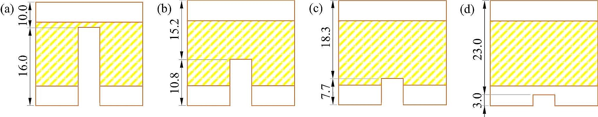 Flat bottom holes, (a) FBH-1, (b) FBH-2, (c) FBH-3, and (d) FBH-4, were drilled from the inner side of the TCP samples. Measurements are in mm