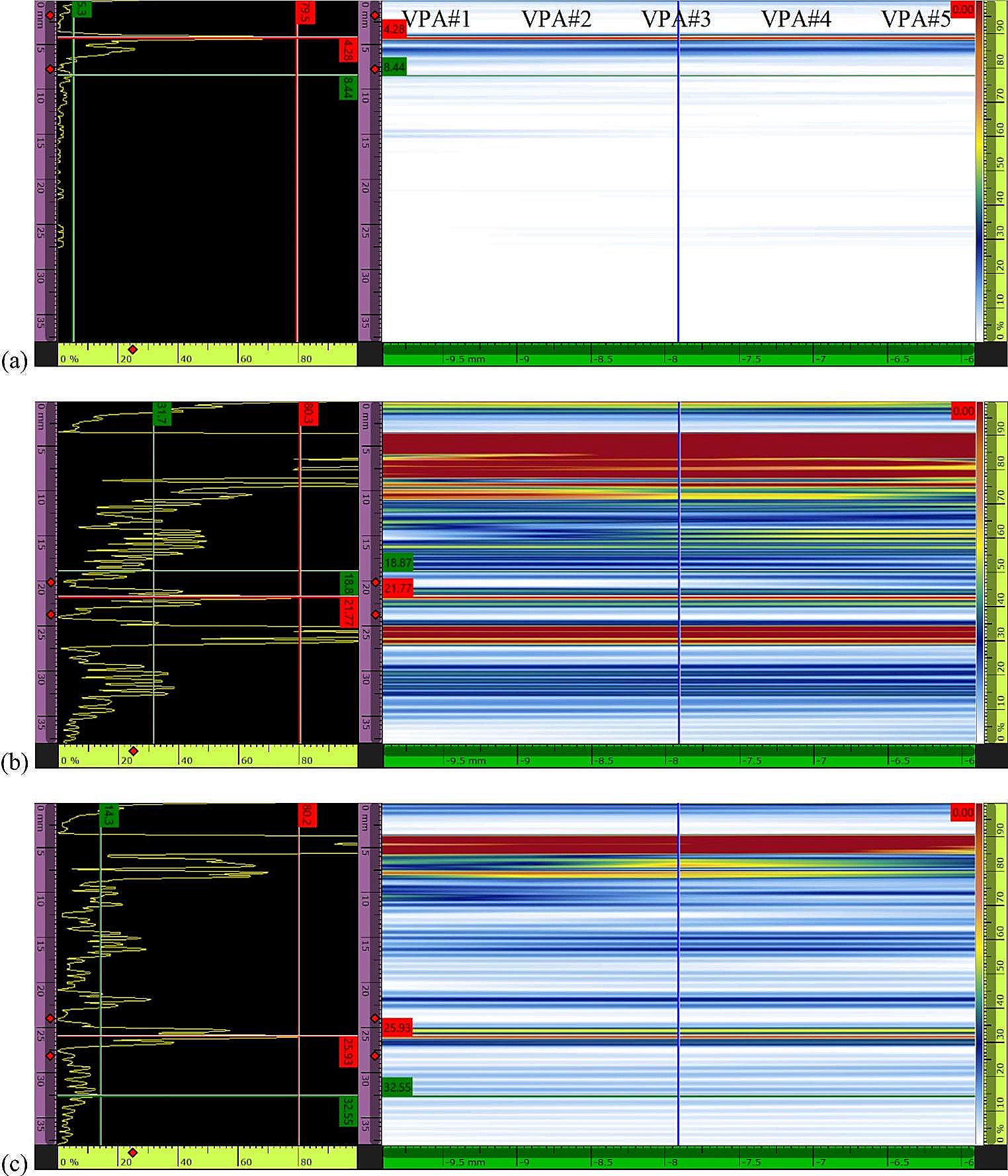 Initially, the instrument’s gain setting was configured so that the signal from the first interface layer reached approximately 80% of the full-screen height (FSH), which was measured by an electronic gate positioned over the respective pulse width in the A-scan view. However, this gate was subsequently removed and substituted with the red cursor to minimize excessive indicators in an image, as shown in Fig. 3(a). This cursor indicated both the maximum amplitude height and the depth location of the first interface layer. The corresponding outer cover layer was considered the minimum thickness reference for the two-point calibration. After that, the gain setting was further increased to detect signals from the second interface layer and back wall to establish maximum thickness references. The red cursors in Fig. 3(b) and (c) marked both the maximum amplitude height, aligning closely with 80% of the FSH as measured by the virtual electronic gate positioned over the corresponding pulse width, and depth location of these two signals, respectively. The calibration was iteratively performed, considering two different maximum thickness references for each focal law, to compensate for element-to-element sensitivity variations in the ultrasonic array [7] before a single average velocity value was determined, as listed in Table 1.