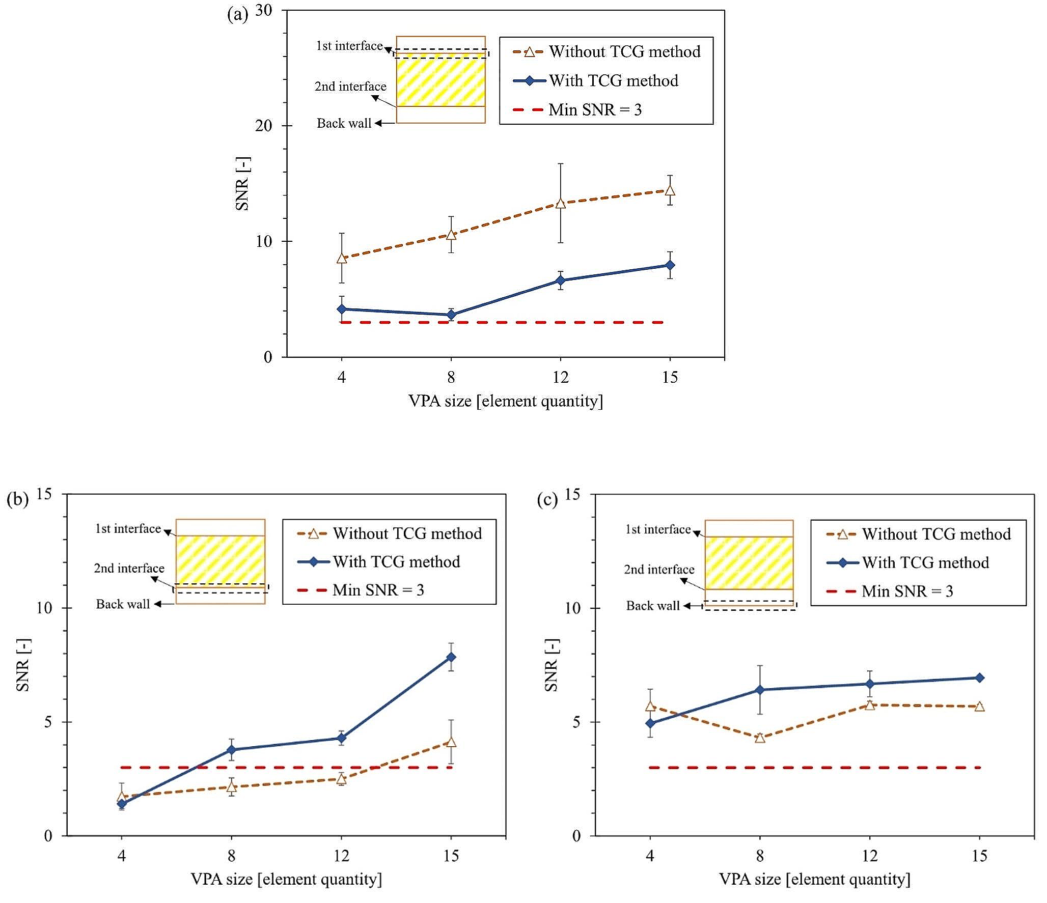 Meanwhile, SNRs of the signal from the second interface layer and back wall improve after implementing the TCG method and with increasing VPA size, as shown in Fig. 6(b) and (c), respectively, except for the 4-element VPA. The difference between the average signal amplitudes of all three signals of interest recorded by the 4-element VPA and the average signal amplitude for all tests used to determine the TCG points was higher than that for the rest of the larger VPAs. This difference can be visualized in Fig. 4(d), (e) and (f), where the vertical distance between the dotted line representing the average signal amplitude for the 4-element VPA, and the dashed green line, which represents the average signal amplitude of all tests used for the TCG points determination, is the farthest.