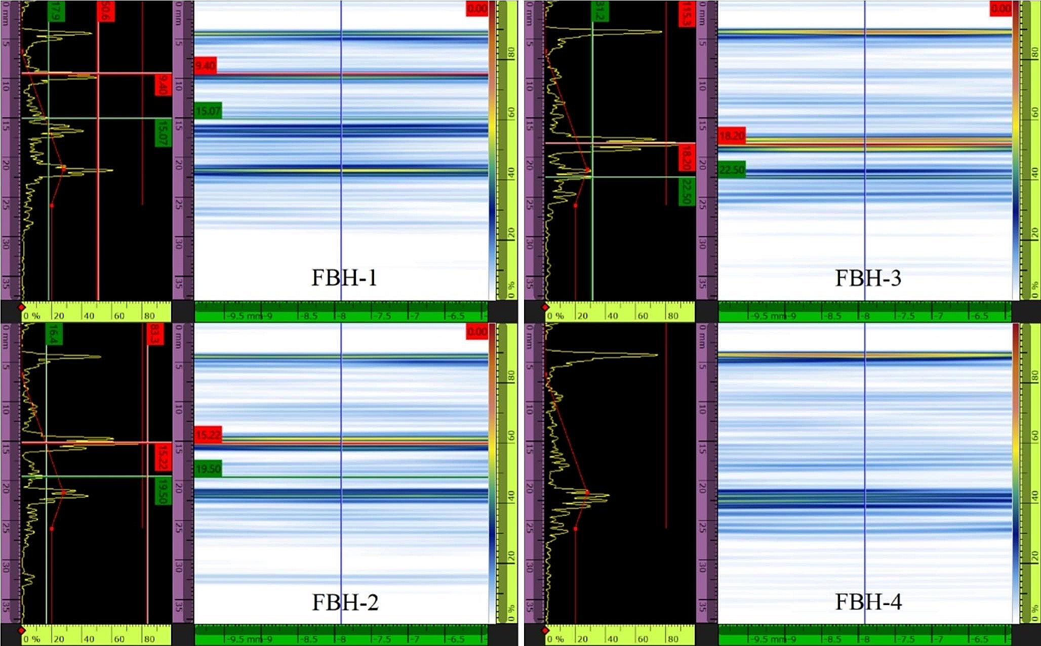 where \({d}_{meas}\) and \({d}_{act}\) are the measured and actual distances of the FBH, respectively. The measured depths of the FBHs, marked by the red cursors in Fig. 7, were compared with their actual depths, and the corresponding relative errors are listed in Table 3. In general, the relative error is relatively low, which is less than 6%, except for FBH-1, which reports a relatively high relative error of up to 9%. Nevertheless, the values are still reliable in determining the position of the defects. It is essential to highlight that without implementing the TCG method, signals originating from these FBHs might become indistinguishable from the background noise. This scenario could lead to the inadvertent selection of the wrong signal.