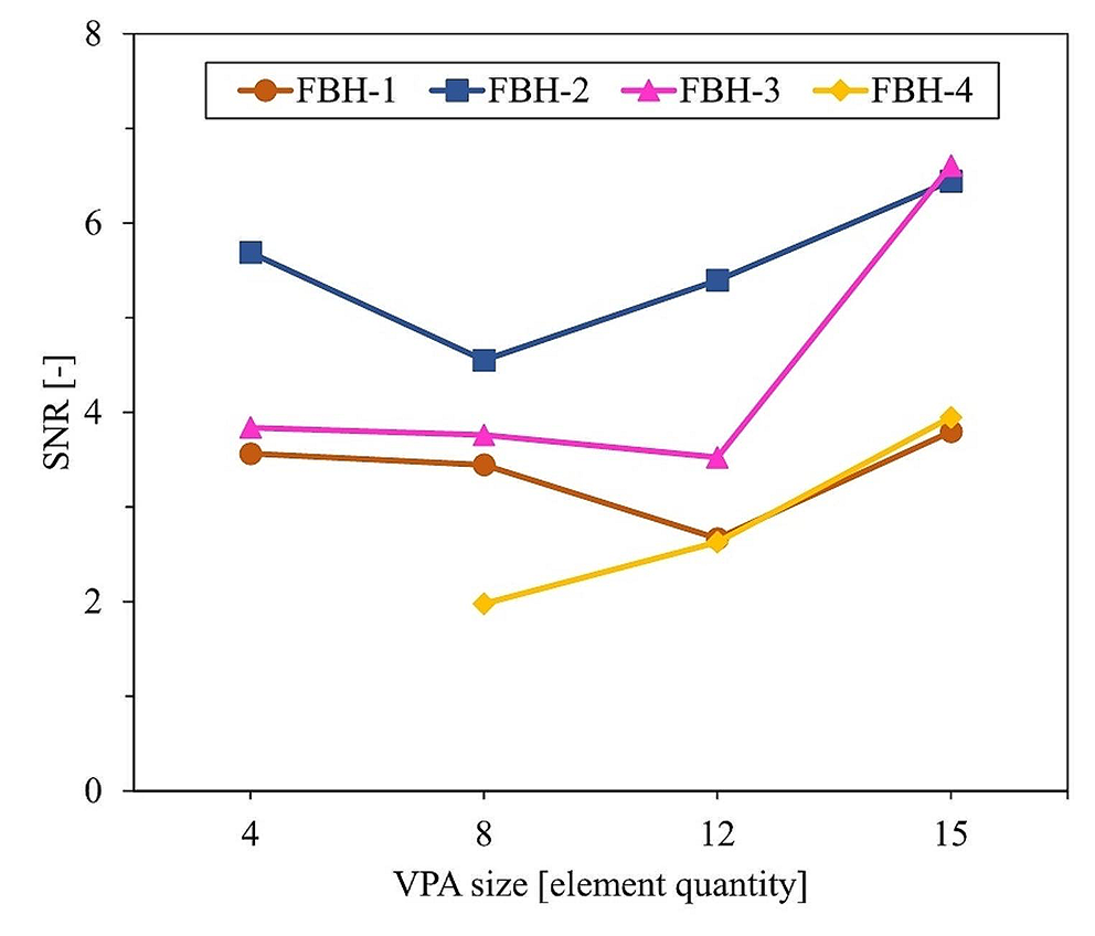 To further assess the effect of the VPA size in detecting the FBHs, SNRs were measured considering the defect signals and the background noise. Figure 8 shows the increasing trend of SNR with increasing VPA size. It is observed that the largest VPA records the highest SNRs for all FBHs. In general, SNRs are improved with increasing VPA size due to less unwanted beam spreading in the far-field and an achievable sharper beam focus in the near-field zones [7, 24, 27]. It is worth noting that some uncertainty factors have influenced the SNRs and depth measurement, such as average velocity in multi-layered material with slightly different sound velocities and the presence of the reflected backward energy within the transducer when the gain was significantly increased [22, 25]. SNRs for FBH-2 are higher than those of FBH-1 and FBH-3 because the location of this FBH was relatively farther away from the first and second interface layers. While the proximity of the increased reflected backward signal within the transducer caused the uncertain trend of the SNRs with increasing VPA size, the studies found that the largest 15-element VPA detected the defect with the highest SNR. This uncertainty factor could be eliminated by implementing an immersion technique so that the signal of interest has some added distance beyond the position of the unwanted signal occurring early in time-based view.