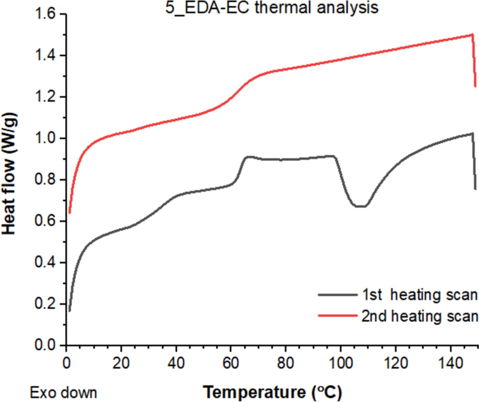 DSC scans of the 5_EDA-EC sample that was UV-cured at 100°C, in the presence of breathing air, with a 1.2 mW/cm2 UV-light intensity. The sample was subsequently analyzed with 20°C /min heating scans from 0 to 150°C