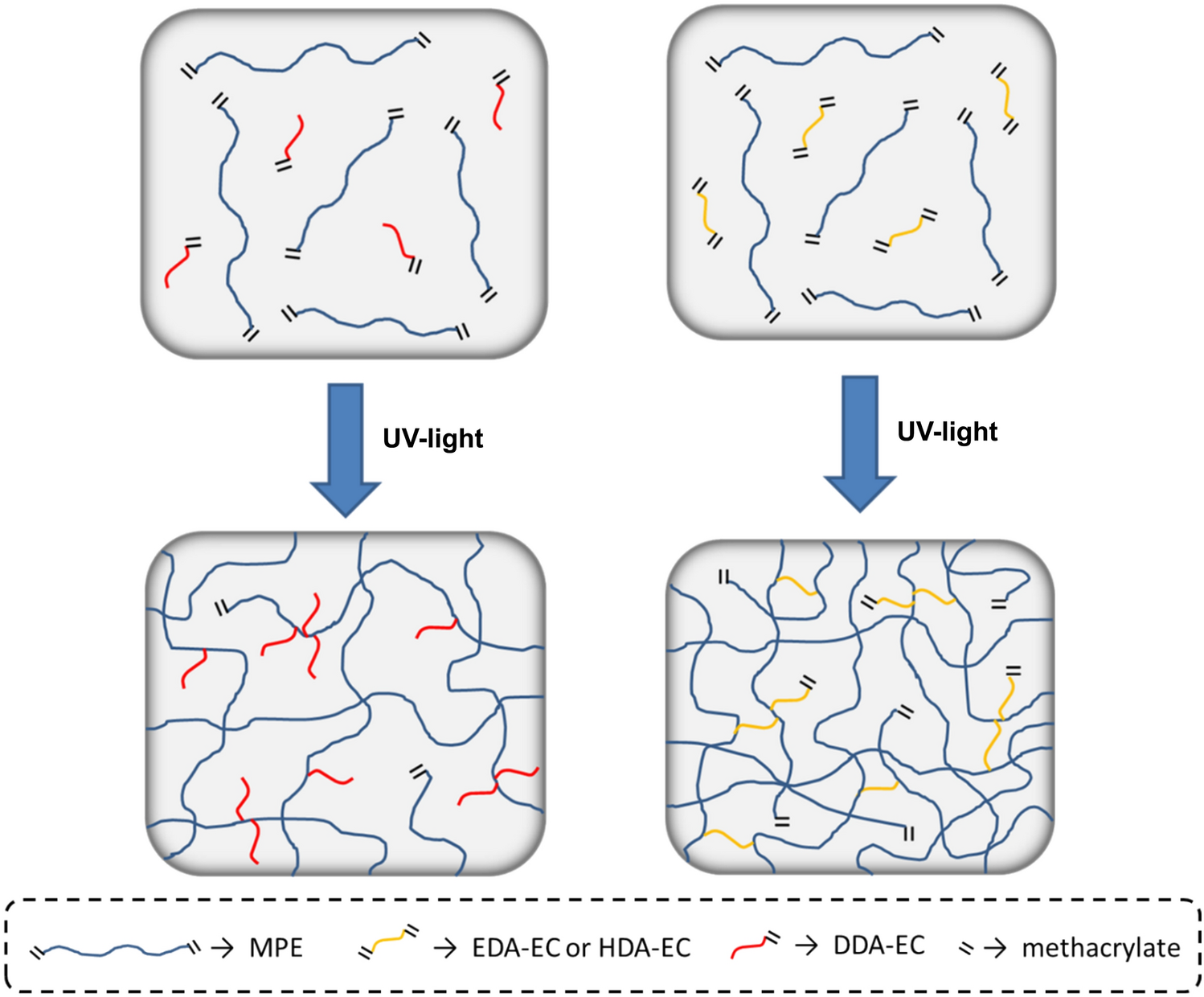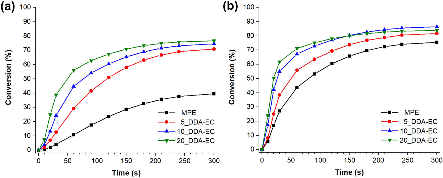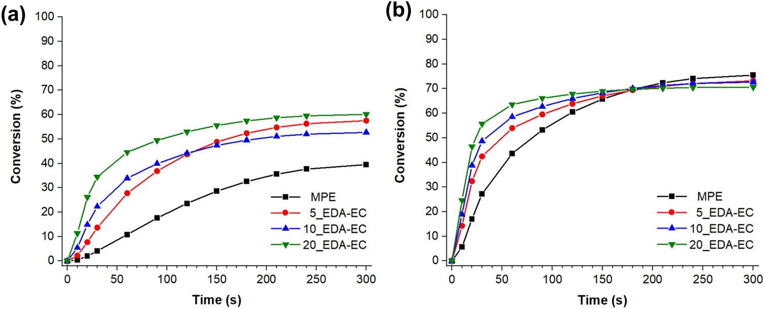 Of the two di-functional reactive diluents that were studied, the reactive diluent with the longer methylene spacer group (HDA-EC) consistently achieved higher conversions than the reactive diluent with the shorter methylene spacer group (EDA-EC). The lower conversions that were obtained with the EDA-EC reactive diluent was likely a consequence of two factors: (1) the development of more densely crosslinked polymer networks, which limited the ultimate conversion because of vitrification; and (2) the shorter chain length of this reactive diluent, which limited its ability to diffuse through the crosslinked matrix to partake in additional crosslinking reactions. Conversely, the longer spacer group of HDA-EC facilitated higher ultimate conversions for the opposite reason, i.e., the longer chain length of HDA-EC made it more likely to encounter another photoinitiator or propagating monomer or oligomer. Regardless, both di-functional reactive diluents increased the ultimate conversion compared to the MPE control due to their viscosity reducing effect and their ability to diffuse through the crosslinking medium more effectively. Figure 11 depicts the different crosslinked networks encountered in this study when either a mono-functional (DDA-EC) or di-functional (EDA-EC or HDA-EC) reactive was used. When the di-functional reactive diluents were used, more highly crosslinked networks were obtained. However, these networks also contained a relatively high concentration of unreacted functional (methacrylate) groups, i.e., lower conversion. Conversely, when the mono-functional reactive diluent was used, less densely crosslinked networks were obtained but these networks also contained less unreacted functional groups.