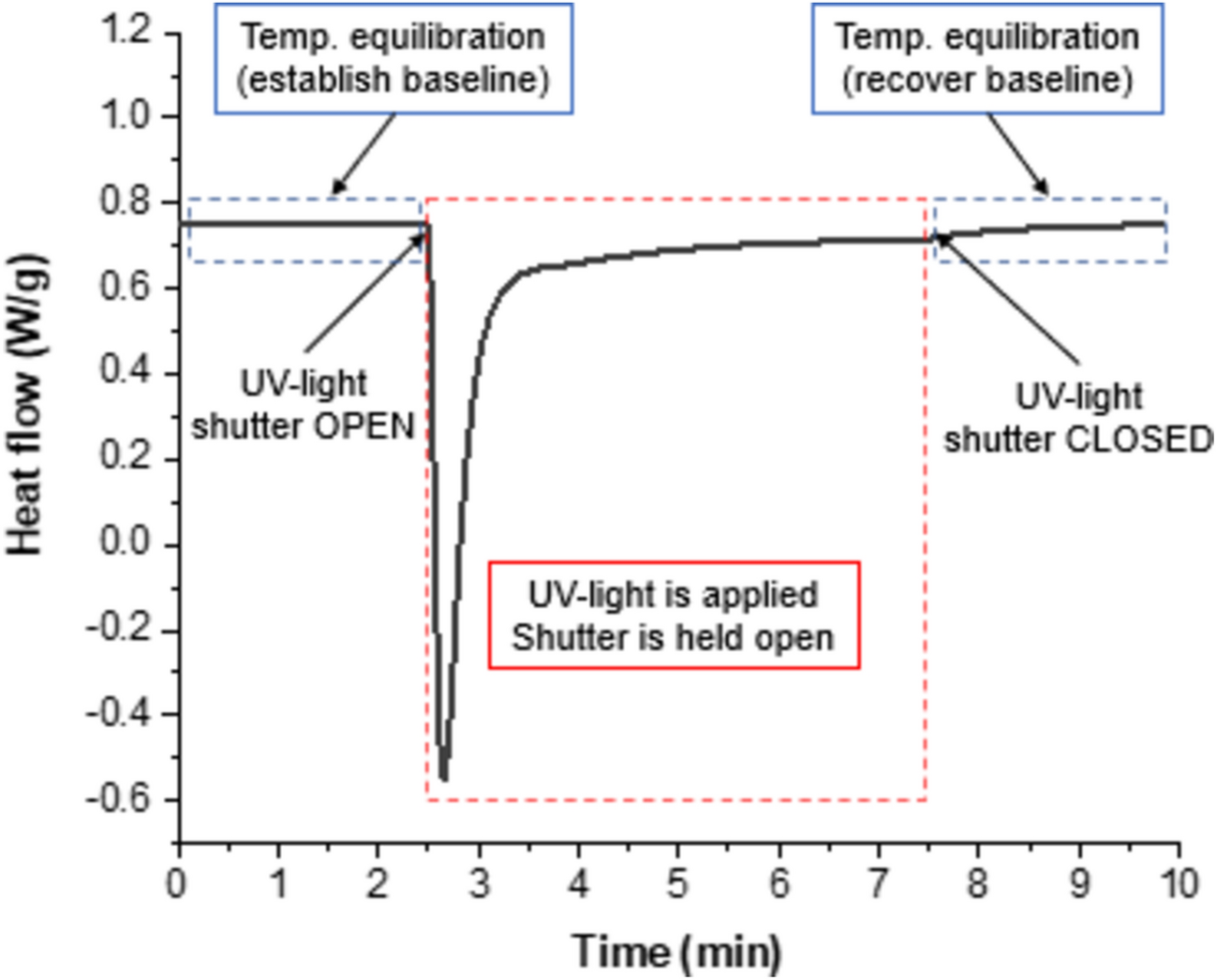 Illustration of the photo-DSC experimental procedure highlighting the temperature equilibration periods and the period of UV-exposure. Total run time for each experiment was 10 min. This particular experiment (run 1 of 3) used formulation 10_DDA-EC and was conducted in a nitrogen atmosphere at 100°C, using a UV-light intensity of 1.2 mW/cm2