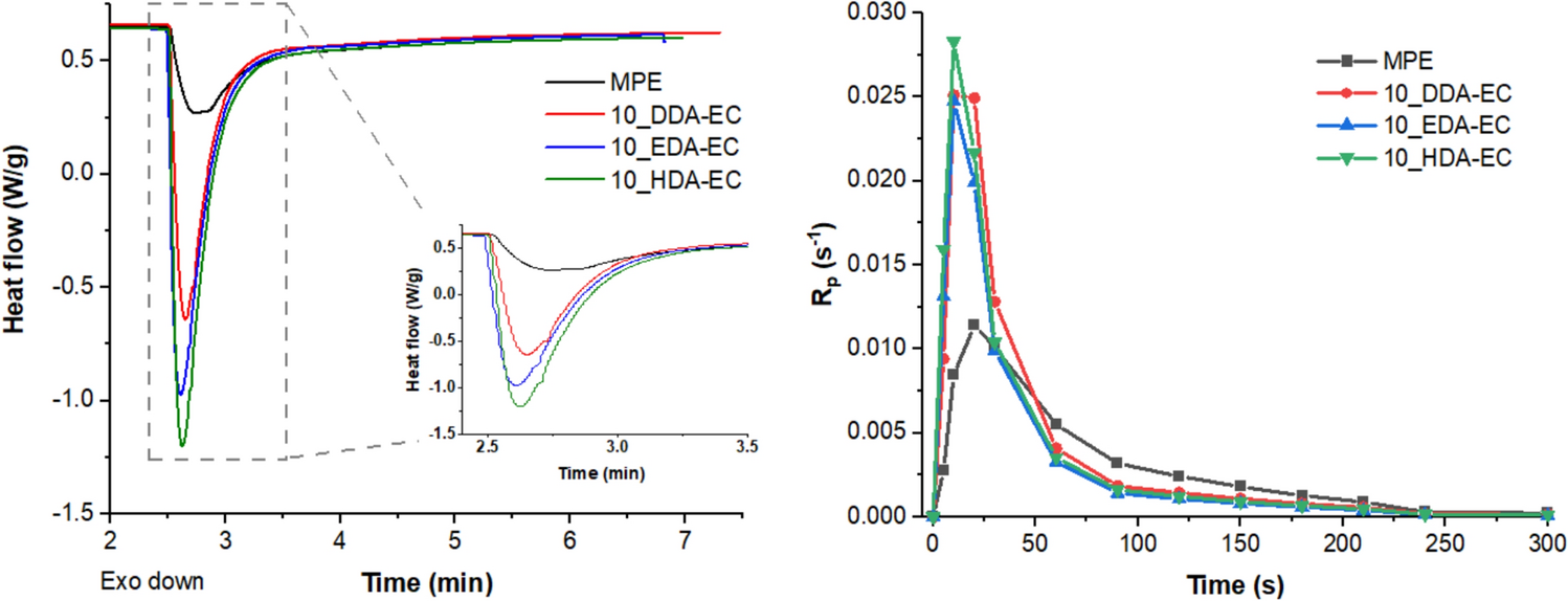 Illustrates the heat flow (W/g) vs time for the MPE formulation compared against the formulations that contained 10 wt% reactive diluent (left) and the Rp vs time for the same formulations (right). The samples were polymerized in a nitrogen atmosphere, at 100°C, using a light intensity of 1.2 mW/cm2