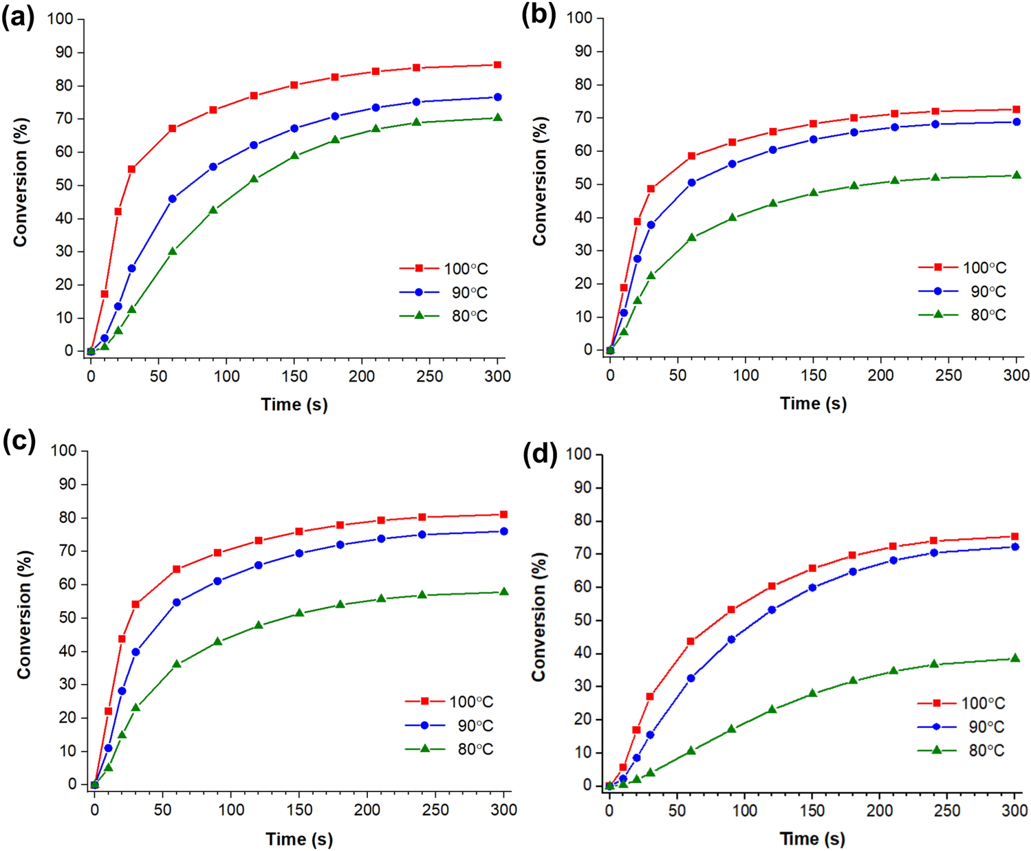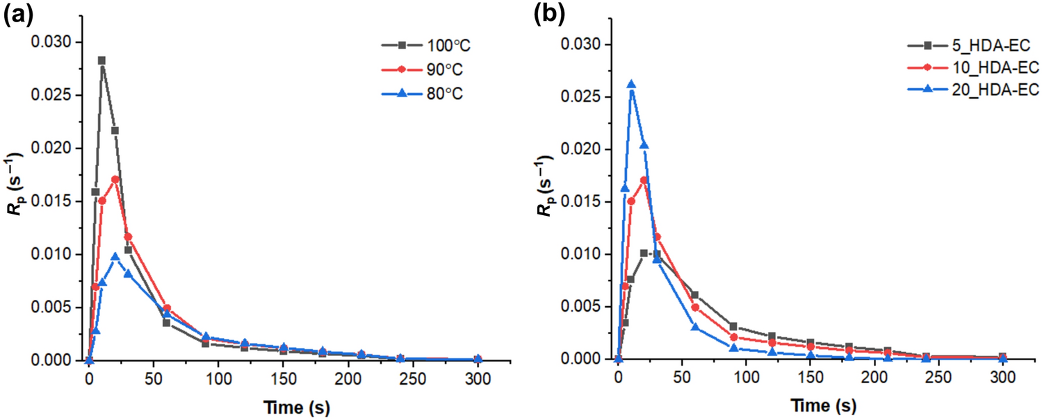 Tables 2 and 3 report the maximum polymerization rate (Rpmax) and the time it took to reach the maximum polymerization rate (tRpmax), respectively, for the different UV-curable powder coating formulations. The tRpmax is an important characteristic of UV-curable systems because it provides information on how quickly a system reaches the maximum polymerization rate. A full understanding of this attribute can help in the development of more uniform crosslinked networks with optimized material properties. The Rpmax was strongly related to the reactive diluent loading level and the curing temperature that was used. The Rpmax was consistently higher for the reactive diluent-containing formulations compared to the MPE control, which did not contain any reactive diluent. When the loading level of the reactive diluent was increased, a systematic increase in the Rpmax was observed. For example, the Rpmax of the MPE at 100°C was 0.011 s−1 while the formulations that contained 5, 10, or 20 wt% HDA-EC reactive diluent had Rpmax values of 0.020 s−1, 0.028 s−1, and 0.039 s−1, respectively. The same trends were also observed when the samples were cured at lower temperatures. However, when the curing temperature was reduced, a noticeable drop of the Rpmax occurred. This was particularly evident as the curing temperature was reduced from to 80°C. Figure 4 shows the Rp versus time for the 10_HDA-EC formulations when cured at 100°C, 90°C, and 80°C (left) as well as the Rp vs time for the 5_HDA-EC, 10_HDA-EC, and 20_HDA-EC formulations when cured at 90°C.
