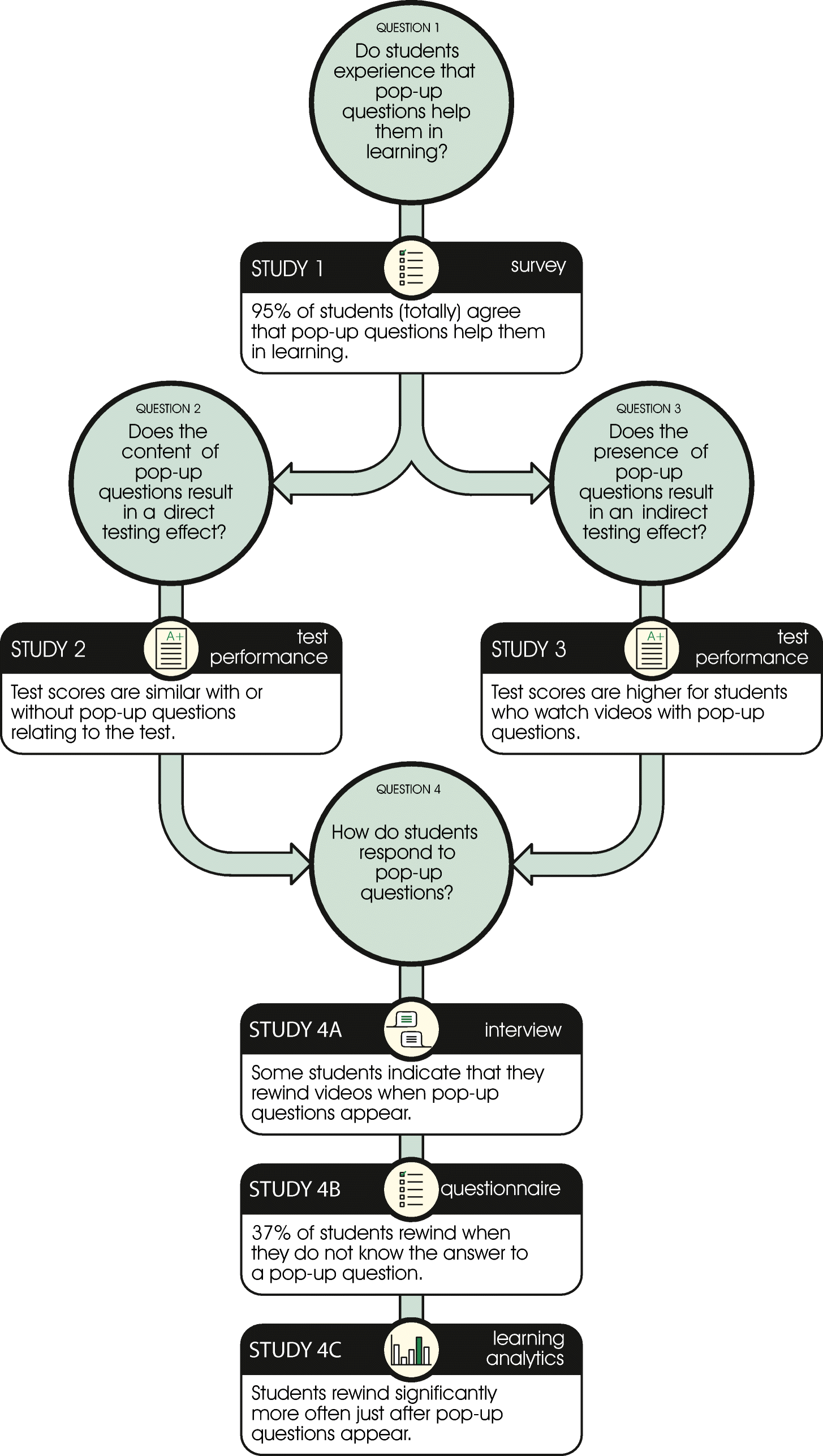 Based on results from these studies, we performed an extra study using focus group interviews to explore how students make use of pop-up questions. This outcome similarly resulted in a next study to explore students’ viewing behavior with the aid of questionnaires. The result of this examination ultimately led to a final study to measure effects of pop-up questions on students’ viewing behavior from learning analytics data.