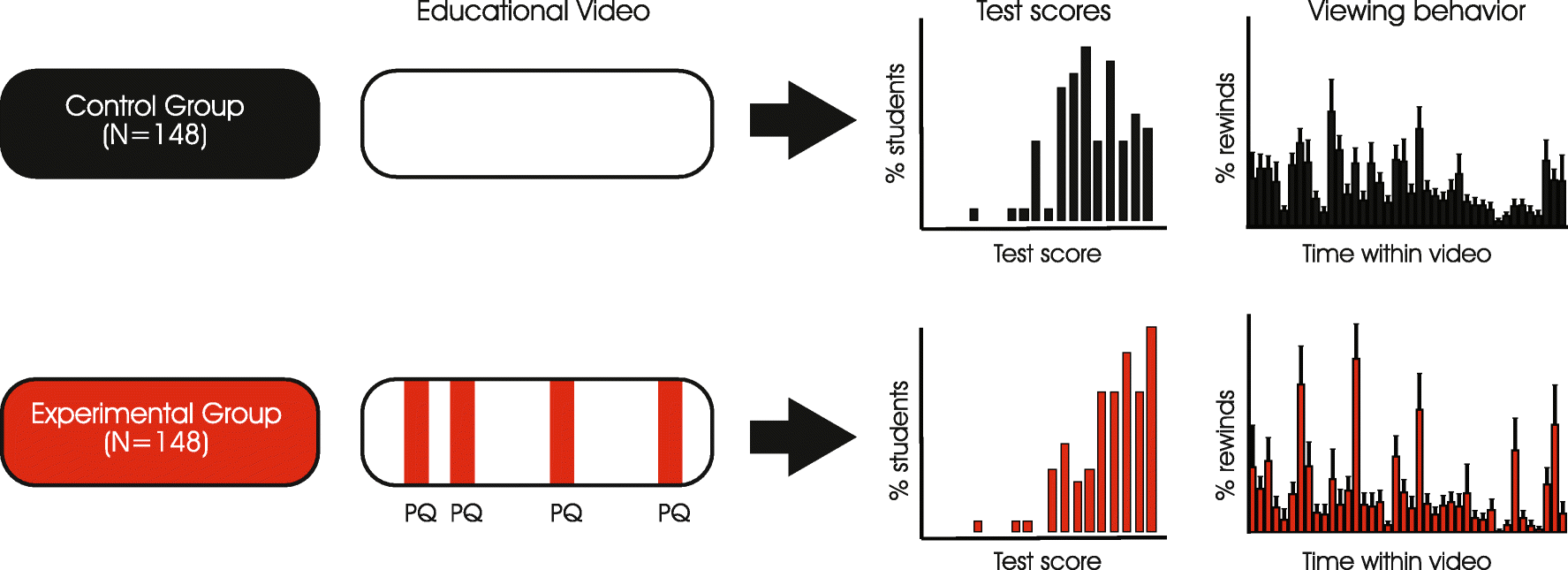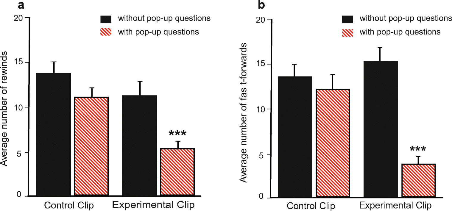 Average number of rewinds (a) and fast-forwards (b) during videos with and without pop-up questions (study 4C). The experimental video clip contained four pop-up questions for the experimental group (N = 120) and no pop-up questions for the control group (N = 117). The control video clip contained four pop-up questions for both the control group (N = 132) and the experimental group (N = 127). Error bars represent standard errors of the means