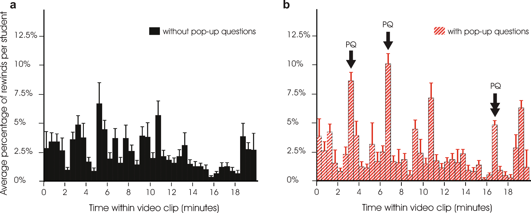 Average percentage of rewinds per student within the time course of a video clip with (a) and without (b) pop-up questions (study 4C). The percentages of rewinds are shown for every 30 s of the video for both the control group (N = 117) and the experimental group (N = 120). The arrows illustrate time points of the pop-up questions shown to the experimental group at 3m22s, 6m31s, 16m39s, and 16m57s. Error bars represent standard errors of the means