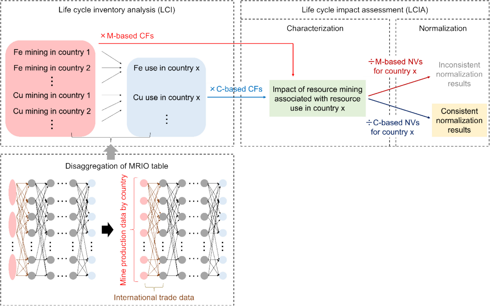Life cycle impact assessment (LCIA) quantifies the potential impacts of environmental loads in the characterization step and evaluates their significance in the normalization step. This study develops consumption-based characterization factors (CFs) and normalization values (NVs) for abiotic resource use using a multi-regional input–output model. Consumption-based accounting in these steps is critical for ensuring consistency between the scope of these steps in LCIA and the overall evaluation scope of the life cycle assessment (LCA) study.