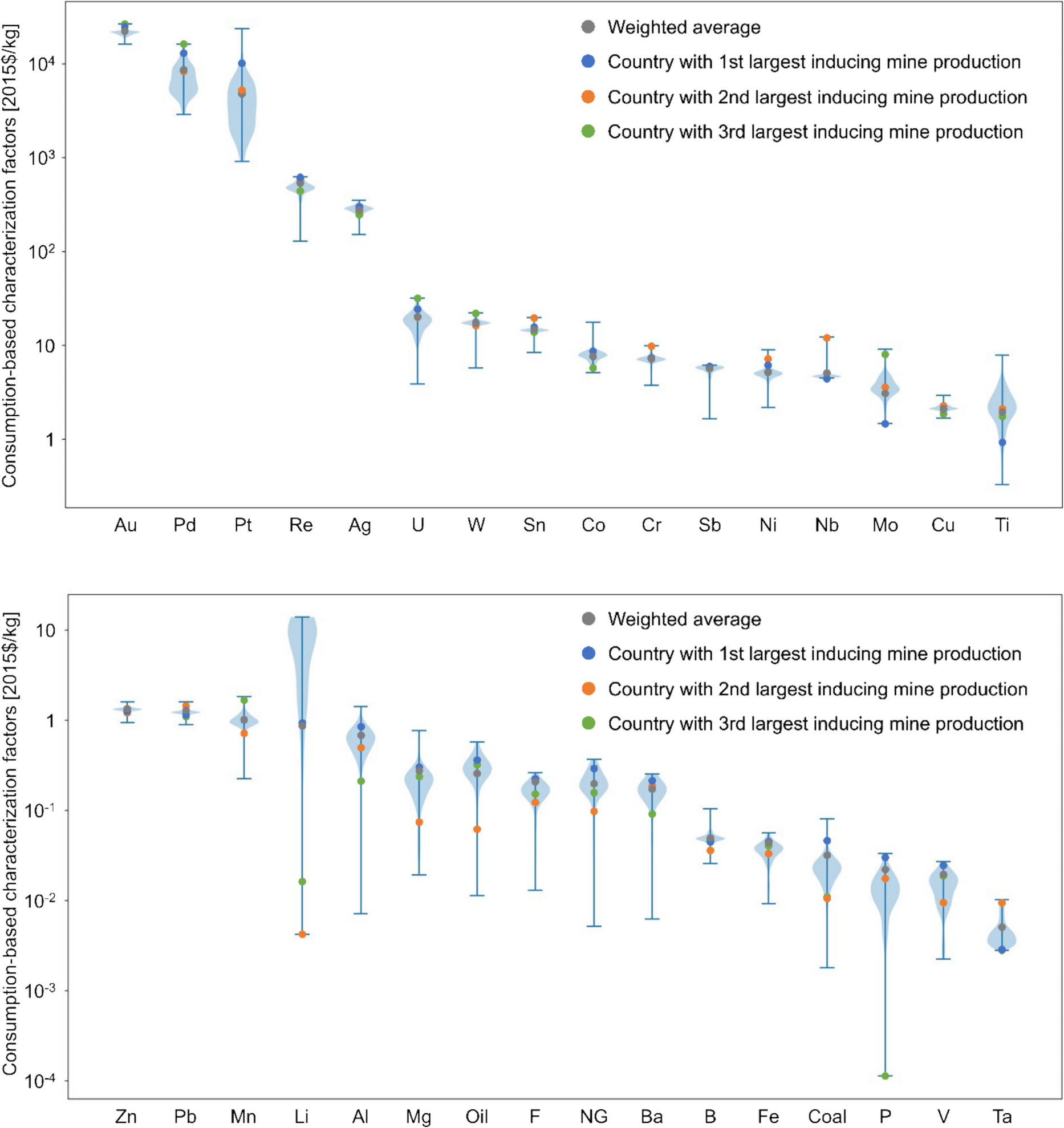 Violin plot of consumption-based characterization factors of abiotic resource use in 2015 in descending order of weighted averages by inducing mine production. A logarithmic scale is used for the vertical axis