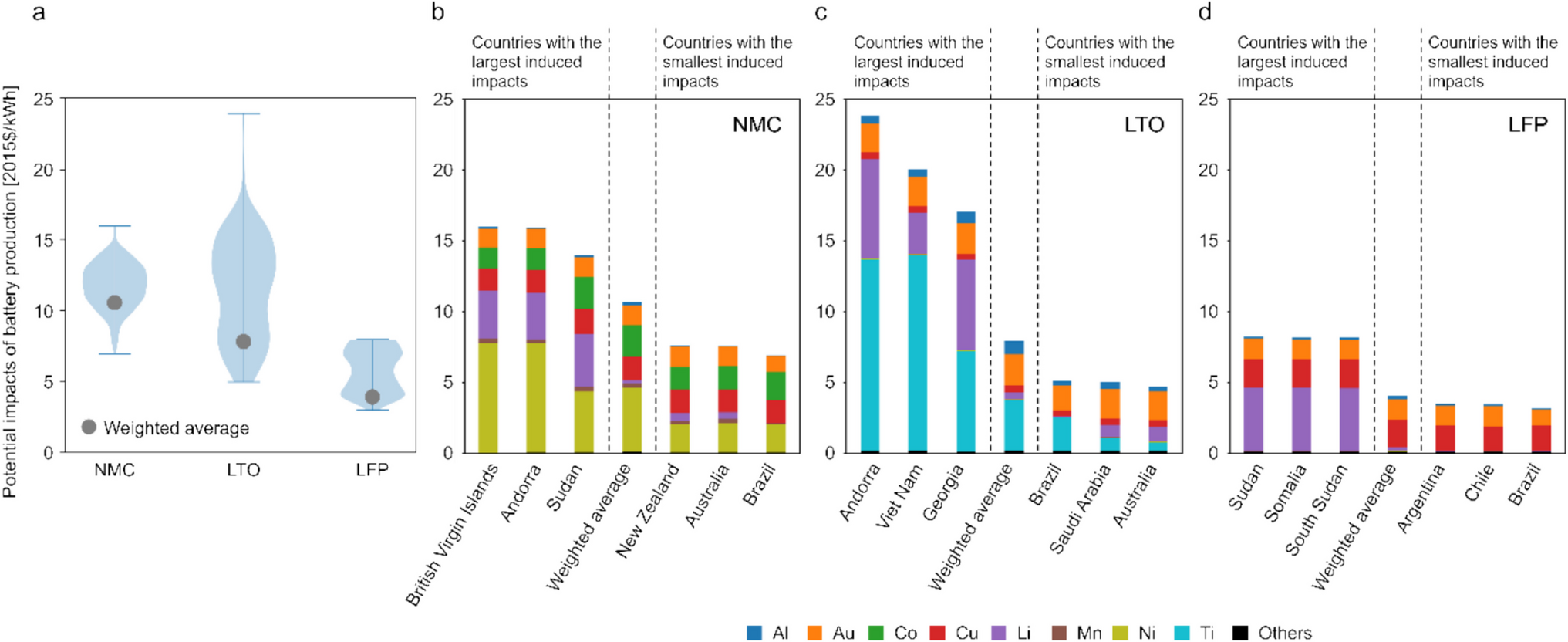 Induced impacts of abiotic resource use associated with the production of 1 kWh of the three lithium-ion batteries. Violin plots illustrate the variation in induced impacts across consuming countries for each battery (a). Breakdown of abiotic resource contributions for the three countries with the largest induced impacts, the induced impacts calculated using the weighted average of CFs, and the three countries with the smallest induced impacts (b–d)