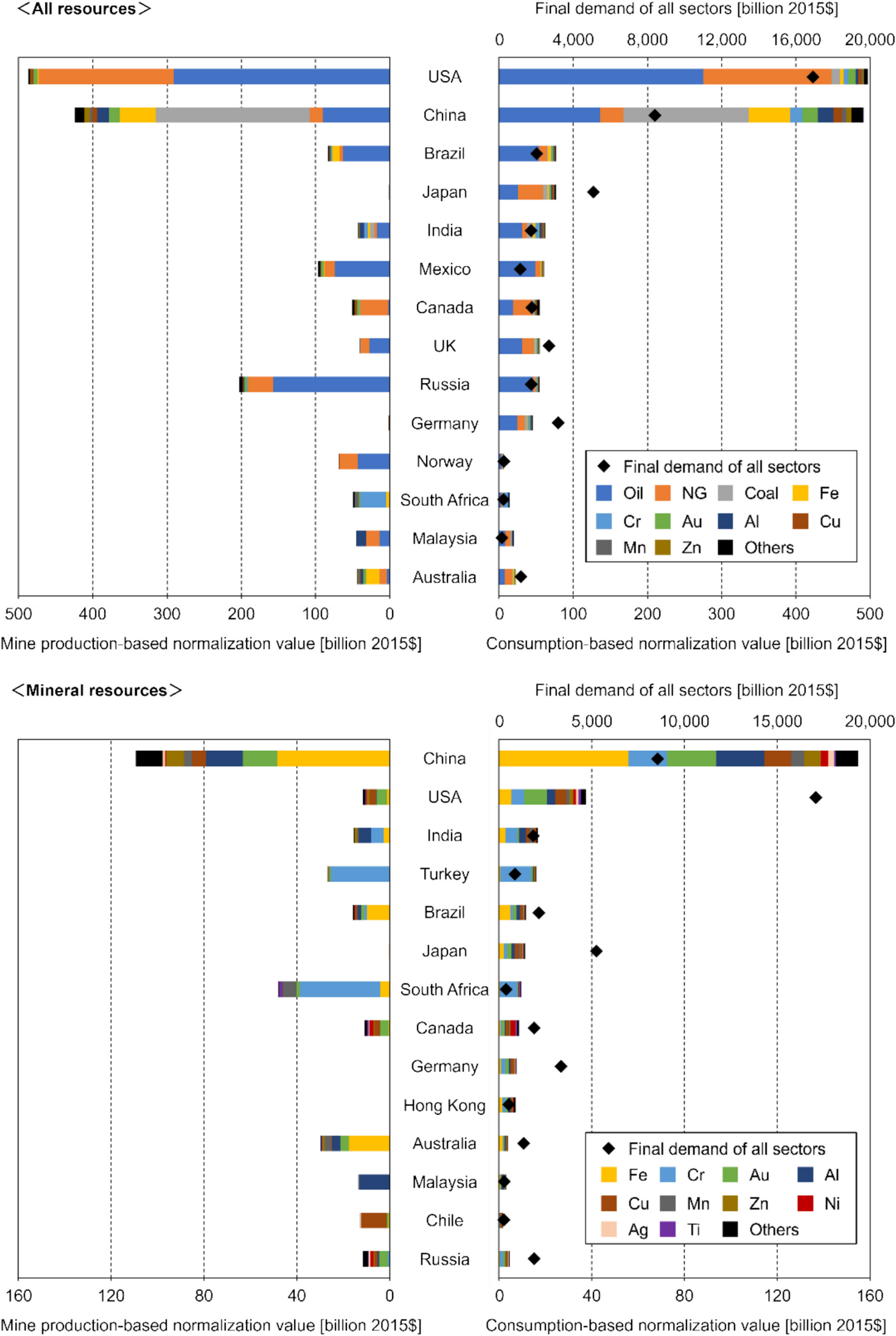 Consumption-based CFs varied significantly, with the maximum values being up to 3,300 times higher than the minimum, depending on the consuming countries. This highlights the importance of considering supply chain differences when assessing the potential impacts of abiotic resource use. The USA had the largest consumption-based NVs, followed by China and Brazil, with fossil fuels as the primary contributing resources. Some countries (e.g., Japan and Germany) exhibited notably higher consumption-based NVs compared to mine production-based NVs, reflecting their scarcity of primary resources in-country and underscoring the relevance of consumption-based NVs. Compared to previous studies with lower resolution for target resources, the consumption-based NVs developed in this study, which differentiate a greater variety of resources, offer more plausible results and enable more flexible analyses targeting specific resources.