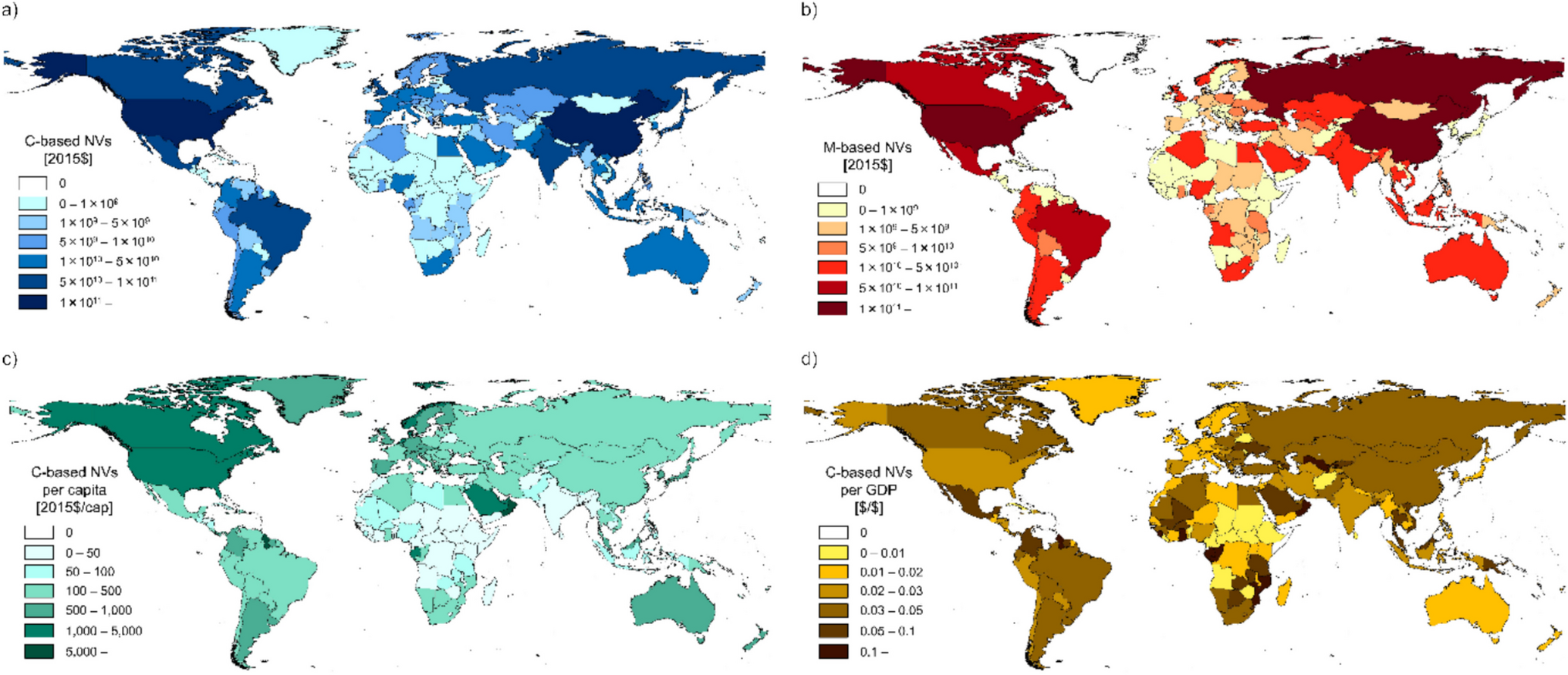 Geographical distributions of consumption-based normalization values (C-based NVs) (a), mine production-based (M-based) NVs (b), C-based NVs per capita (c), and C-based NVs per GDP (d) for abiotic resource use in 2015. The values represent the sum of NVs for the target abiotic resources