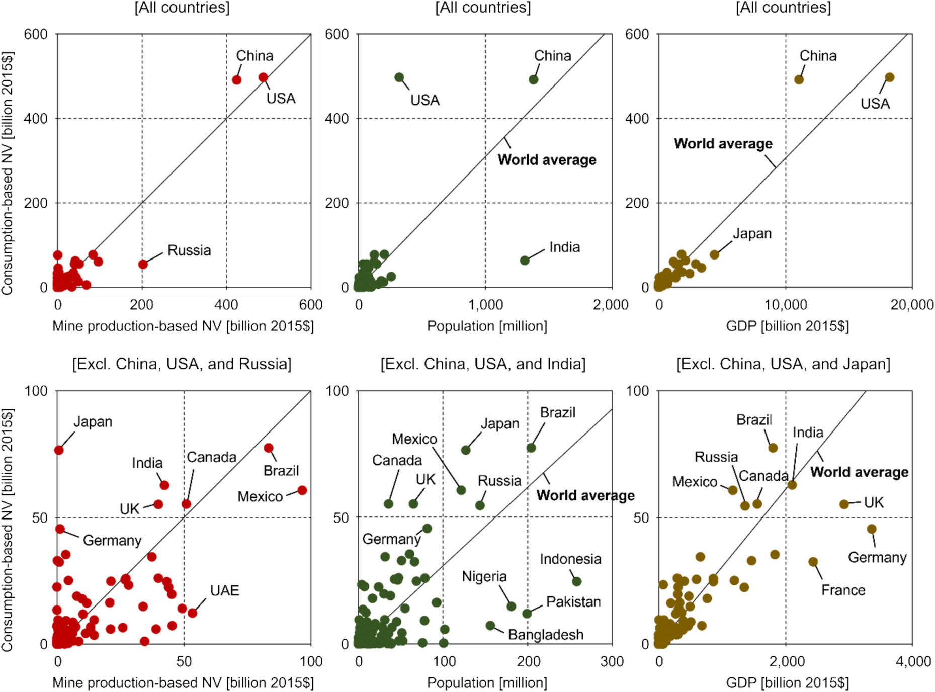 The consumption-based NVs for a country are calculated as the sum of the products of consumption-based CFs and inducing mine production for all abiotic resources. The sum of the consumption-based NVs for all abiotic resources and all countries in 2015 (i.e., the global external cost of abiotic resource use) was 2.3 × 1012 2015$, accounting for approximately 3.1% of the world GDP (Fig. S2) (lists of mine production- and consumption-based NVs are provided in the Supplementary Excel file).